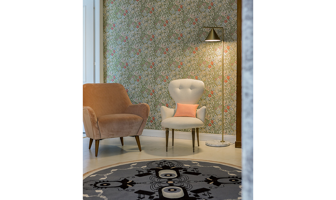 Effetto carta da parati ottenuto con la nuova linea di MT Masking Tape con disegni storici di William Morris. Poltrona bianca [Emporio], lampada Captain Flint [Flos, da €1.024], tappeto in lana e seta Ritournelle & Turlurette