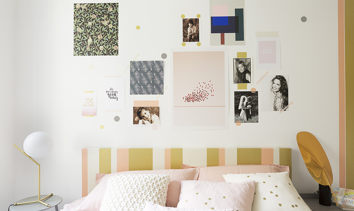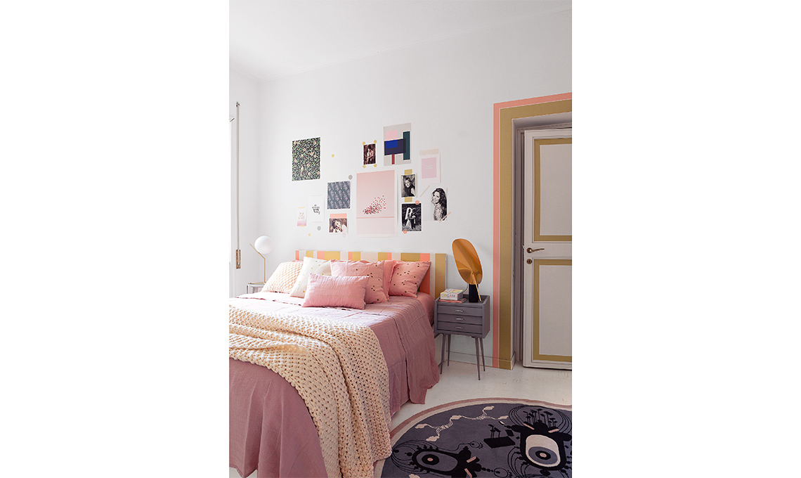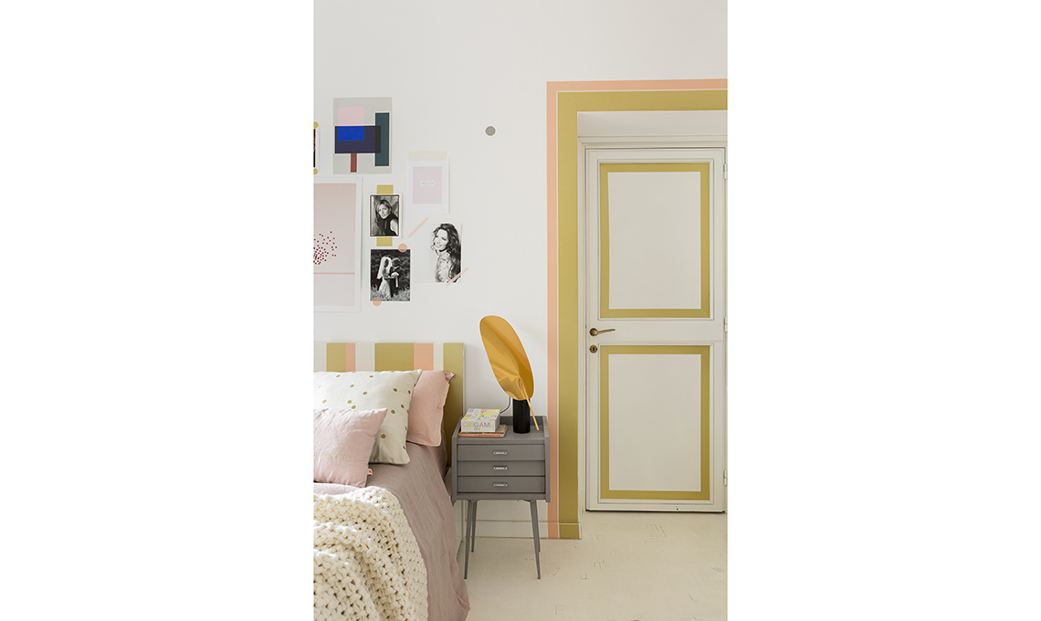 La camera, a differenza delle altre stanze, non è molto grande. La stylist Cristina Gigli, ha pensato di rendere più scenografiche la cornice della porta e la testiera del letto. Sfoderati i washi tape si è passati subito all’azione. Con la linea Casa di MT Masking Tape si può davvero cambiare faccia a una stanza, la porta e la testiera del letto si sono arricchite di fasce dorate e rosa. Sbagli? Stacca e riprova!