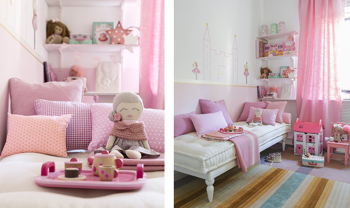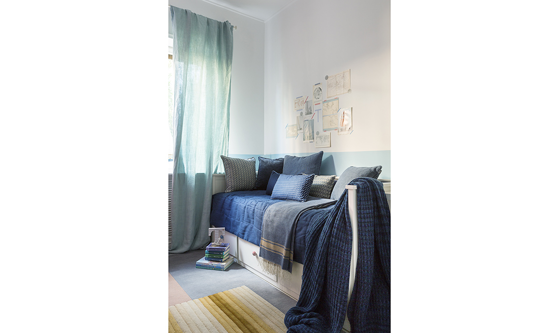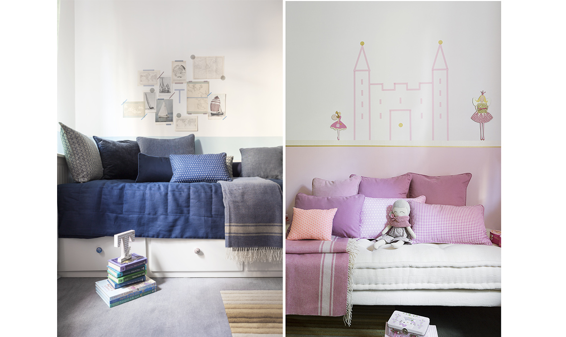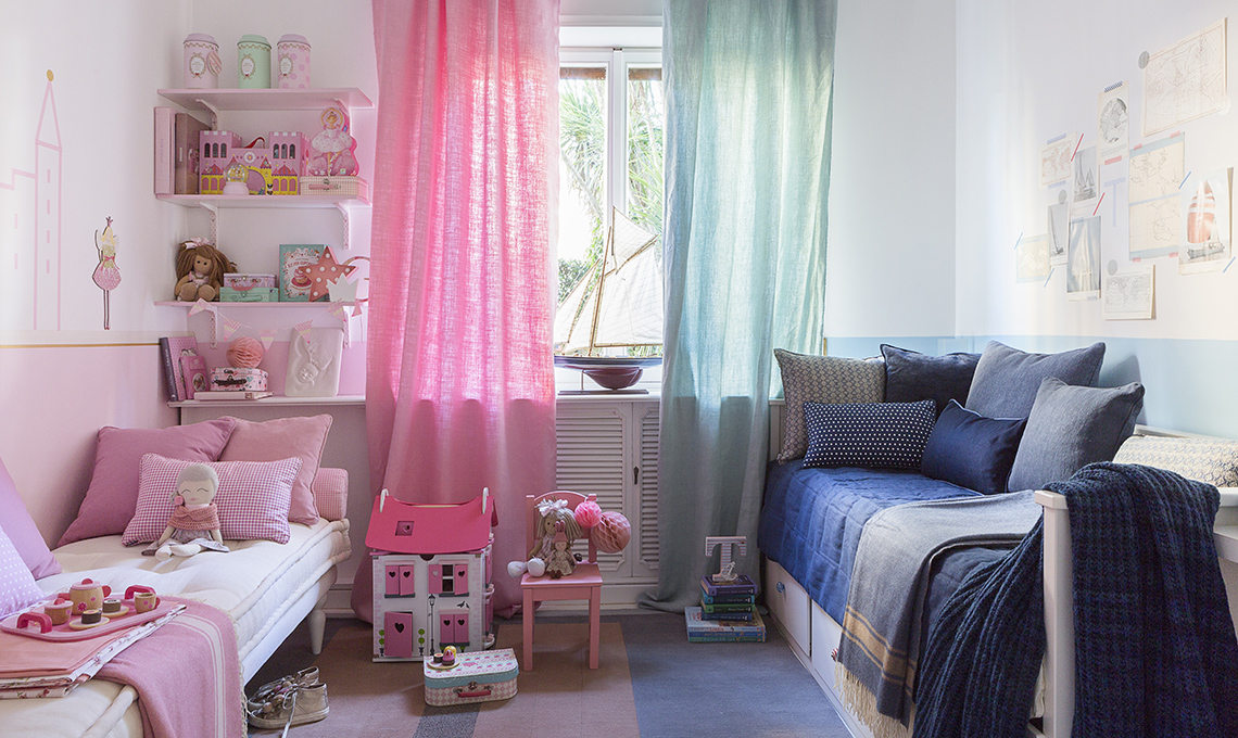 Anche in biblioteca i washi tape sono protagonisti con la linea, effetto carta da parati, della nuova linea con disegni storici diWilliam Morris. Nella cameretta condivisa lo spazio è letteralmente diviso in due dal colore. Azzurro da un lato e rosa dall'altro.