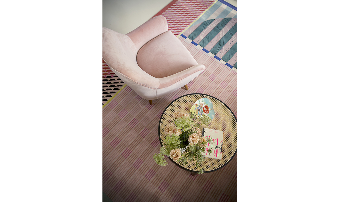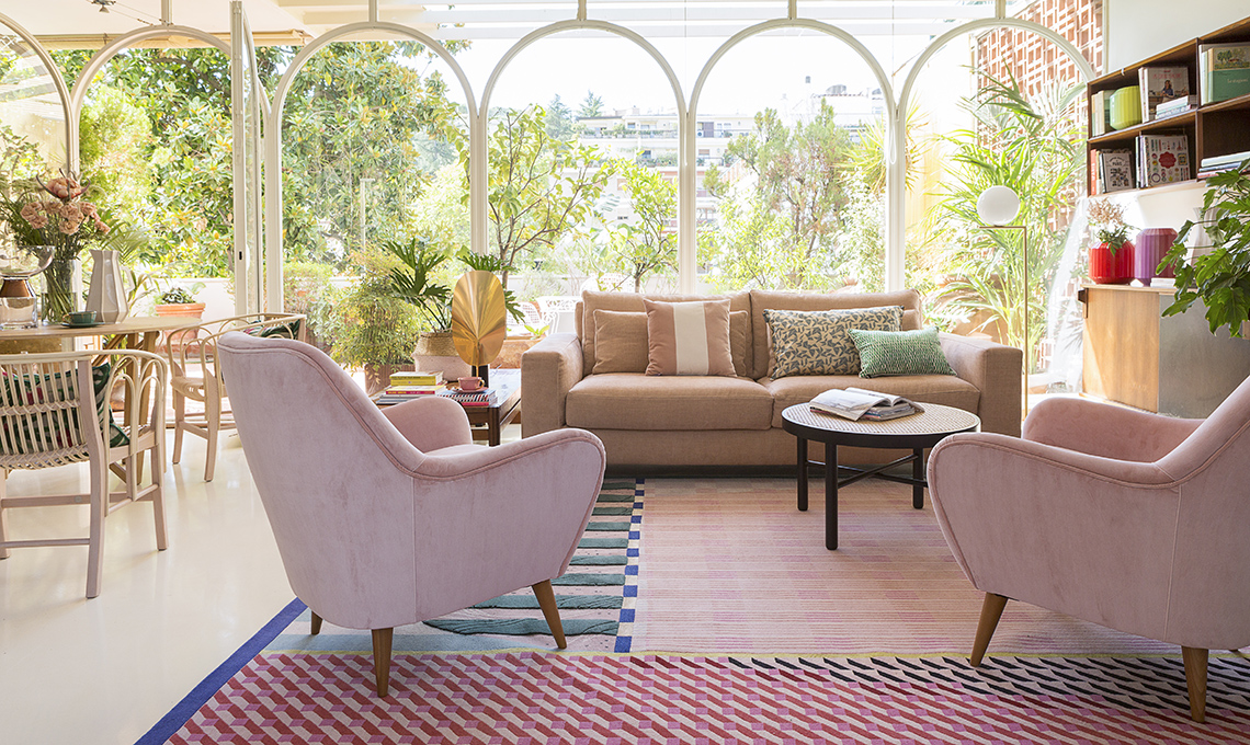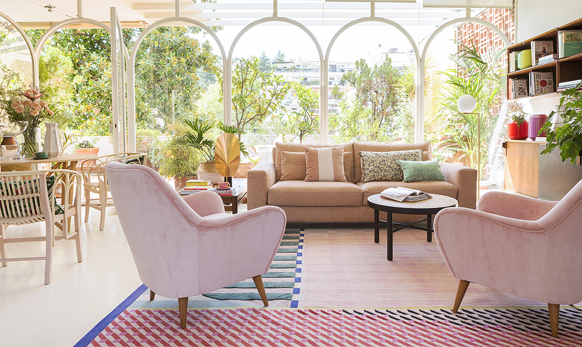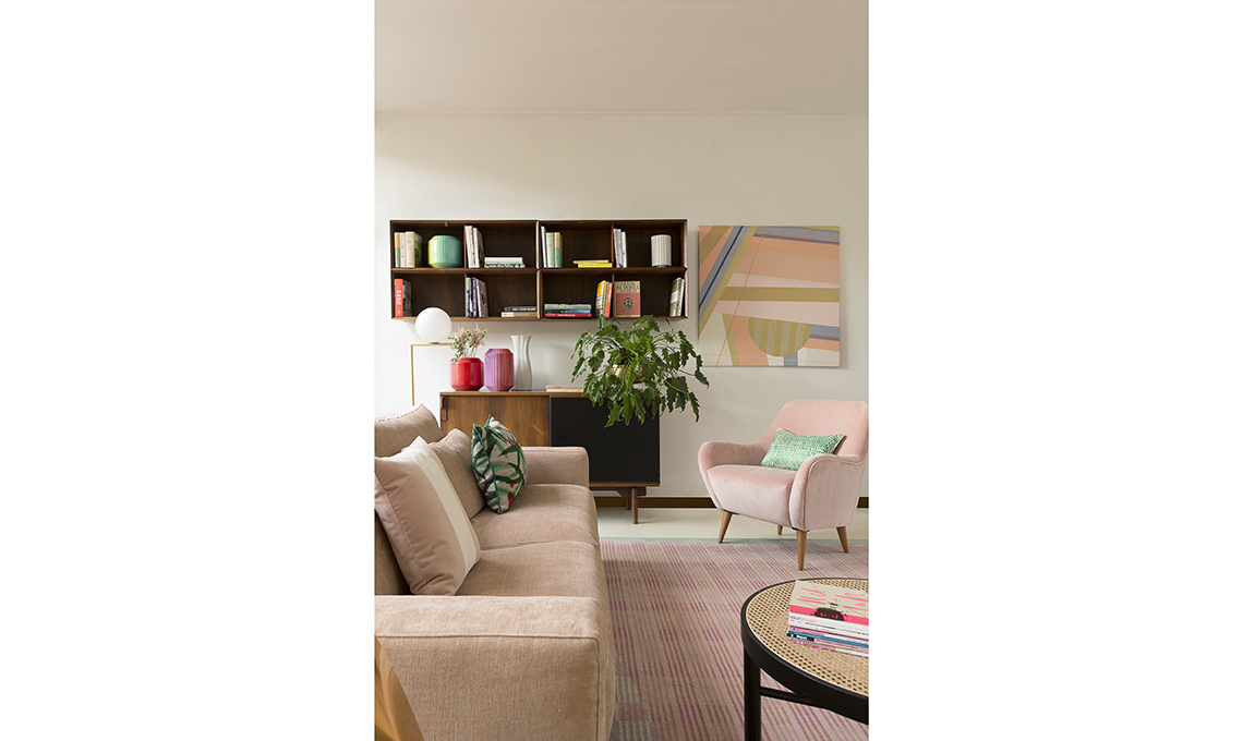 L'intero mood della casa è costruito sulle nuance del rosa, nel salotto infatti spiccano il divano Fly e le sedute Nido di Vibieffe.