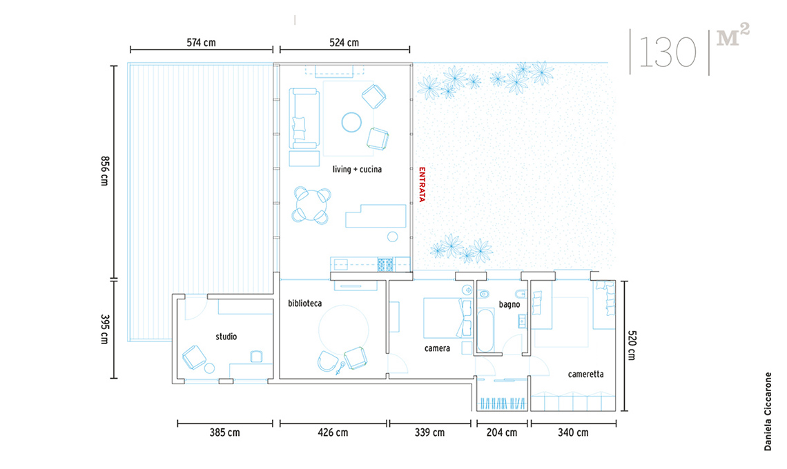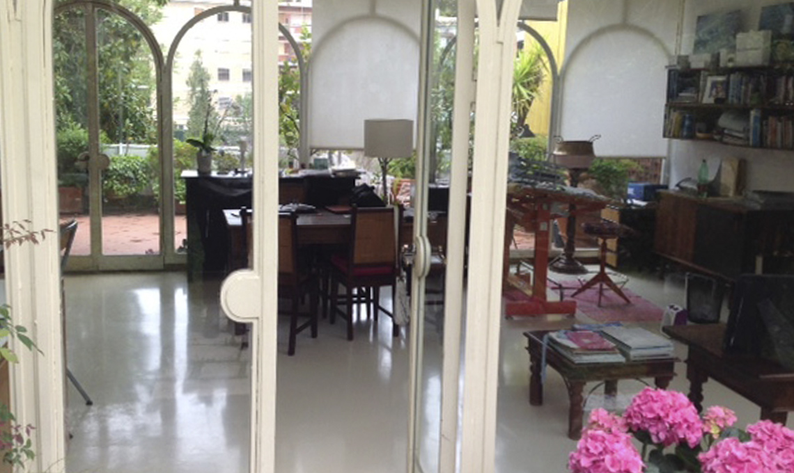 Dal soggiorno openspace si accede alla biblioteca che delimita la zona notte composta da camera matrimoniale, bagno e cameretta condivisa. All'esterno, affacciato sul terrazzo, c'è lo studio workroom di Anabella.