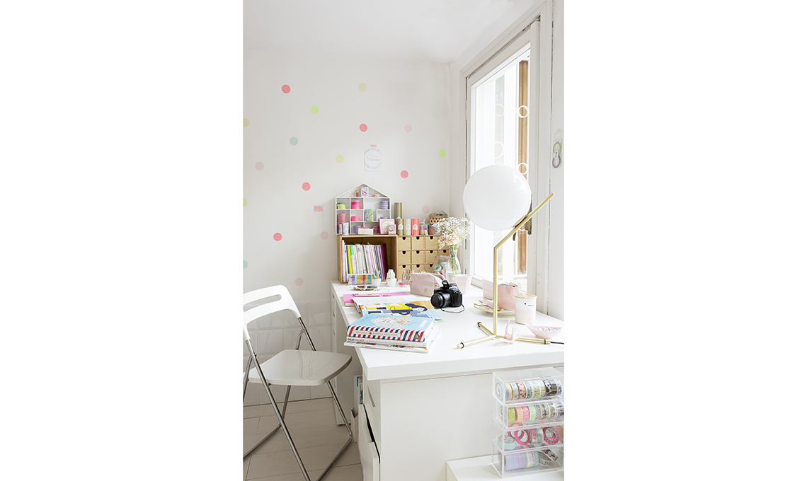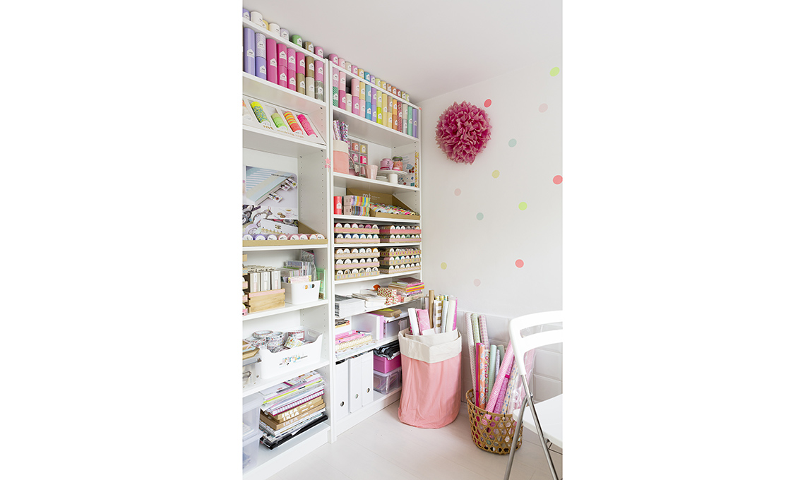 Le librerie Billy [Ikea] sono l'ideale per tenere tutto in ordine. Washi tape, carta origami, timbri francesi, matite, acquerelli, riviste d’ispirazione si dividono in file e nei contenitori.
