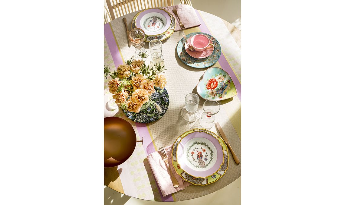 Mise en place: coppa Luna [Paola C.], tazze e piatti La Double J Housewives e posate [Bitossi]. Piatto cuore [Emporio]; piatti di latta [Elite Tins] e calici [Studio Kalff tutto da Mia Home Design Gallery]
