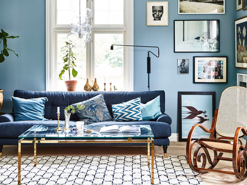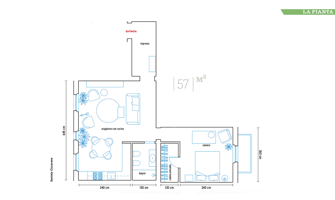 In meno di 60 mq, c'è un ampio e luminoso soggiorno messo in risalto dalle maxi lastre di grès porcellanato blu che caratterizzano i pavimenti di tutta la casa.