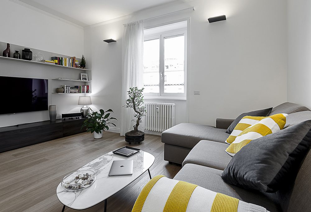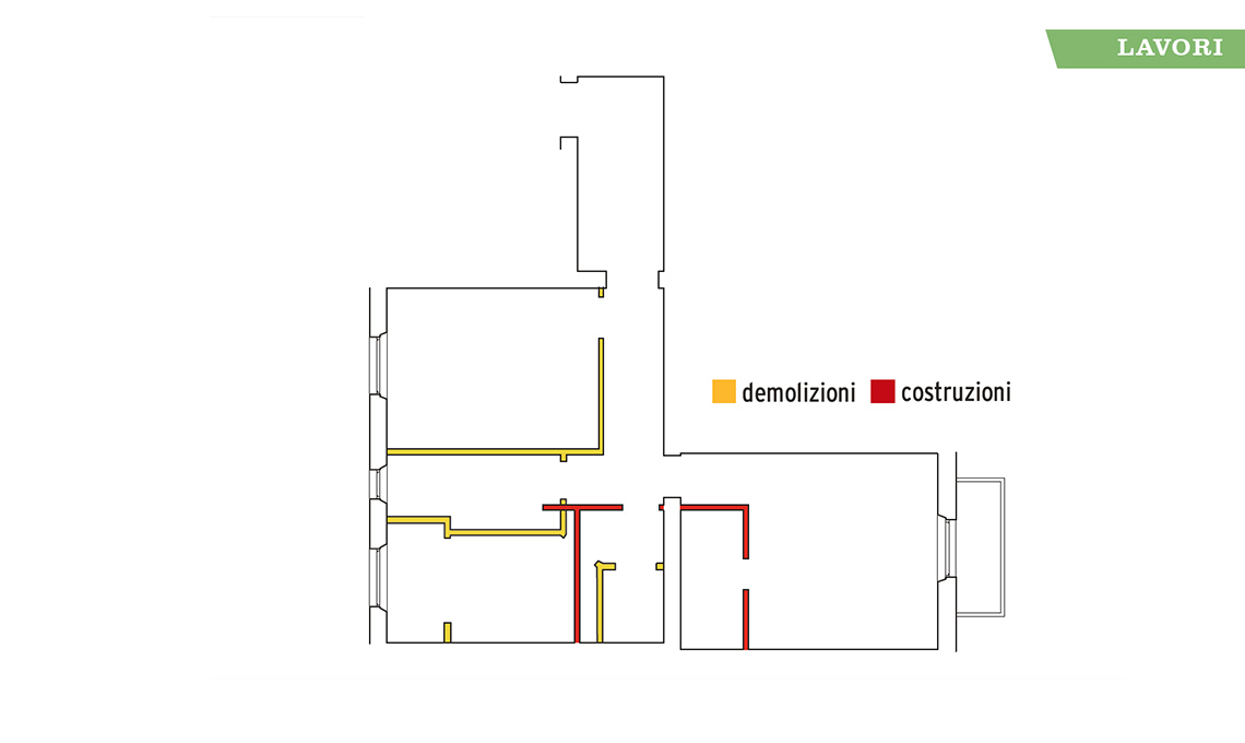 Ora l'appartamento ha un grande living con cucina a vista, lo sgabuzzino è stato trasformato in bagno (che riceve luce grazie a una finestra fissa nella parte alta della parete) e quello che era il salotto è diventata la camera da letto con ampia cabina armadio.