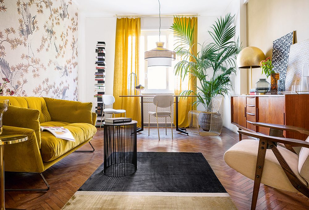 La zona relax ruota attorno alla libreria di famiglia ed è organizzata con il divano Brooke [Maisons du Monde, cm 202x88x88h da €499] con cuscini [Marimekko e Galleria Mia] più un coffee table vintage. Poltrona in vimini [cm 53x71x81h €350] riedizione della sedia a ‘secchiello’ Anni ’60, di [Chehoma] come il tavolino tondo [da €150] con tazza gialla [Coralla Maiuri] e caraffa [Stelton da Dispensabile]; cuscino Japonais Yukata [Le Monde Sauvage]