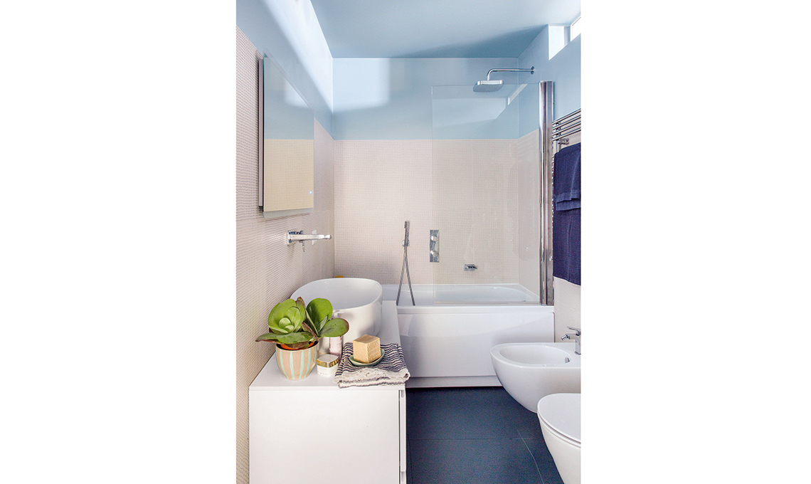 bagno invece è stato dipinto di azzurro cielo. Sulle pareti sono state posate le piastrelle Pico Down Blue Dots Blanc [Mutina] che danno luce al locale. Sanitari [Catalano], vasca [Ideal Standard], rubinetti [Zucchetti]