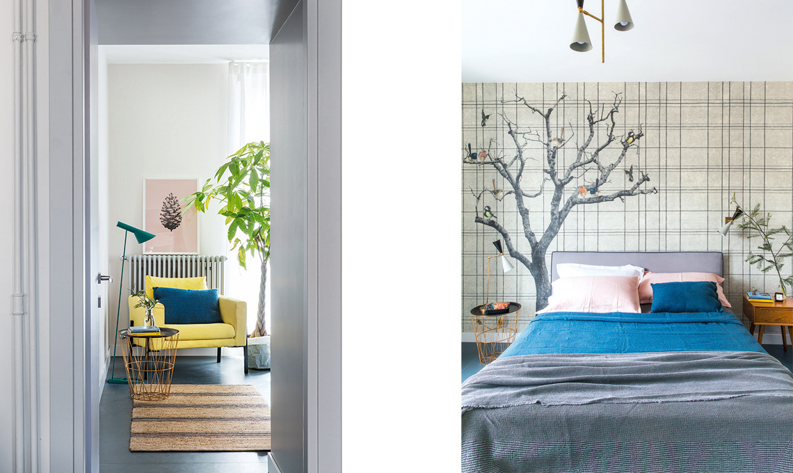 Angolo relax in camera con la poltrona Koarp giallo oro [Ikea, cm 83x78x75h €139,90], il tavolino in metallo [Maisons du Monde, ø cm 40 €21,99], la piantana AJ [Louis Poulsen da Dispensabile €890] e il tappeto a righe [Galleria Mia]. Stampa [Paper Collective da €49], cachepot [Essent’ial]. La parete dietro al letto è stata personalizzata con la carta da parati The Birds di [LondonArt €73/mq] sulla quale spiccano il letto rivestito in tessuto grigio [Hartè], lenzuola e plaid [da Emporio Roma] e