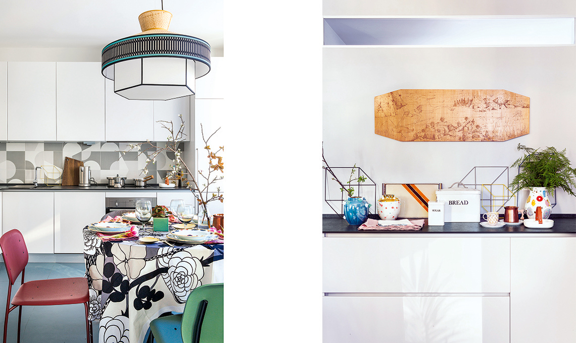 La cucina bianca [Cecchi Cucine] è completata dalle piastrelle Puzzle [Mutina]. Sul top, casseruole Kn Pro [Kn Industrie] più tagliere e vassoio [Dispensabile]. Sospensione Giardino in rattan fatta a mano, con passamanerie e stampe [Servomuto da Galleria Mia]. A destra: vasi e tazza rosa [Coralla Maiuri], vassoio vintage, scatole in latta Bread e Sugar più bricco in rame da [Emporio Roma], piattini bianchi zig-zag e vassoio con manico in cuoio da [Dispensabile]. Sculture cubi in ferro [Antonino Sciortino]