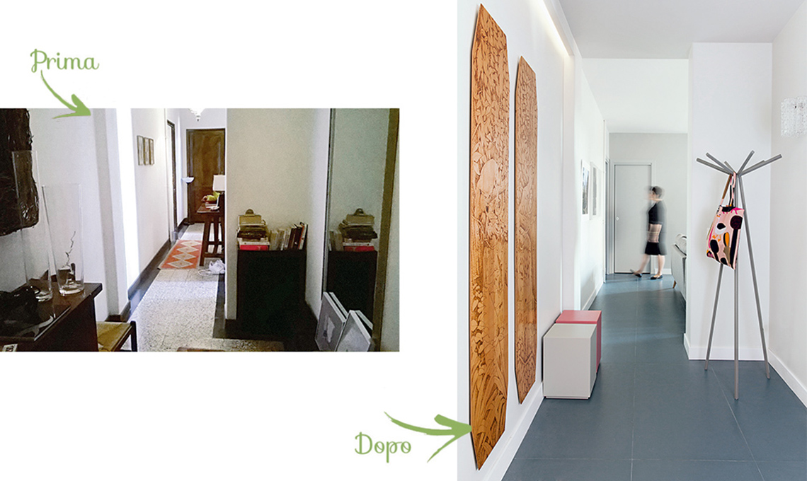L’ingresso era buio, con mobili pesanti e un pavimento scuro in graniglia che appesantiva l’atmosfera. Posando un unico pavimento blu in tutta la casa, dipingendo di bianco pareti e zoccolini e inserendo oggetti e arredi più leggeri l’ambiente si è trasformato.