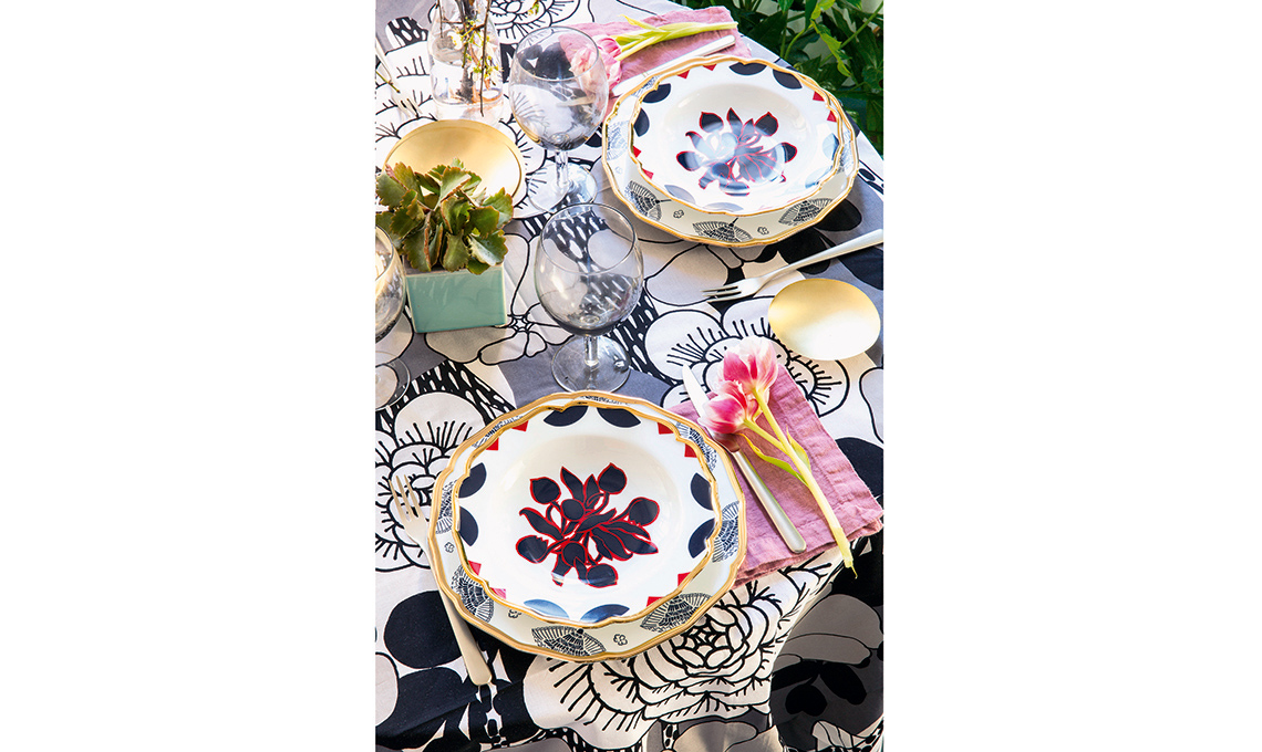 Sulla tovaglia [Marimekko], calici e posate di [Bitossi Home] come il set piatti décor creati