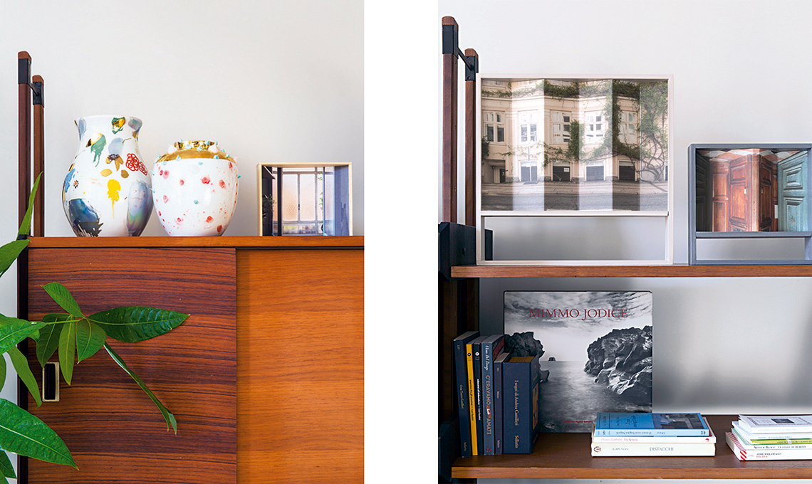 La libreria in palissandro ereditata è contenitore espositivo di oggetti, libri e foto di famiglia insieme ai vasi Ciociara e Marco Polo collection [Coralla Maiuri], cornici e fotografie di Sveva Bellucci [da Dispensabile da €180 cad]