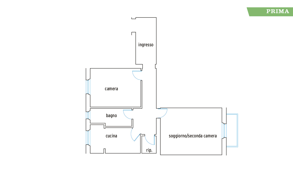 CasaFacile > Case > Prima & Dopo > Una nuova distribuzione degli spazi e il pavimento blu cambiano aspetto a un bilocale anonimo
