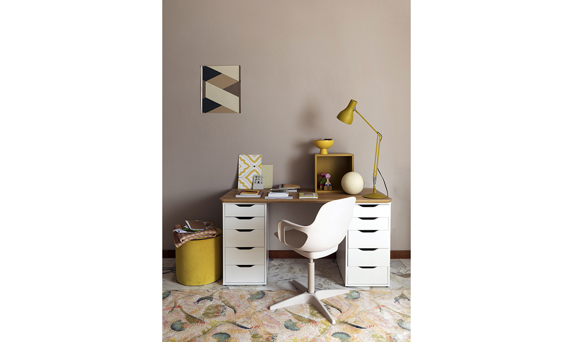 Scrivania composta da due cassettiere Alex [cm 36x58x70h € 70 cad] e un piano in bambù Hilver [cm 140x65 € 60], tutto [Ikea] come la sedia girevole Odger [ø cm 68x90h € 90]. Sopra il top, lampada Type 75 Desk, Margaret Howell Collection [Anglepoise, da Design Republic € 223], contenitore giallo Eket [Ikea, cm 35x25x 35h € 15].