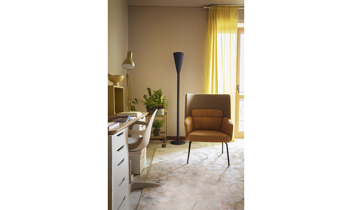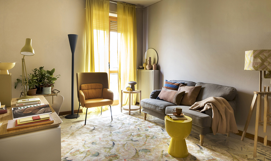 Sul divano Stocksund a due posti [Ikea, cm 154x97x84h € 549], cuscino geometrico [da Nap Atelier] e cuscino a righe e plaid [LaRinascente]. Tappeto Nebula by Cristina Celestino [Besana Moquette € 244 /mq], lampada Lauters con base in legno [Ikea € 49,95] e paralume rivestito in tessuto [da Nap Atelier], pouf in legno laccato giallo [Nap Atelier], tenda Annalouisa in cotone di [Ikea, cm 145x 300 € 29,95/2 teli] come il tavolino Listerby [ø cm 50x56h € 80], vasi [LaRinascente].