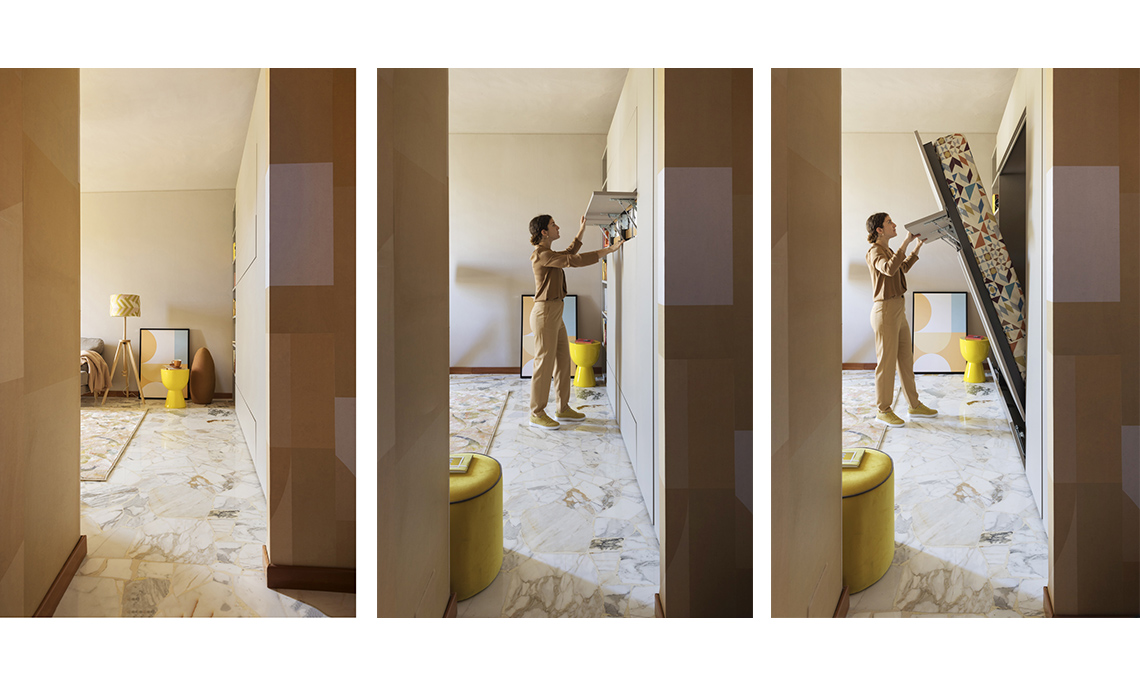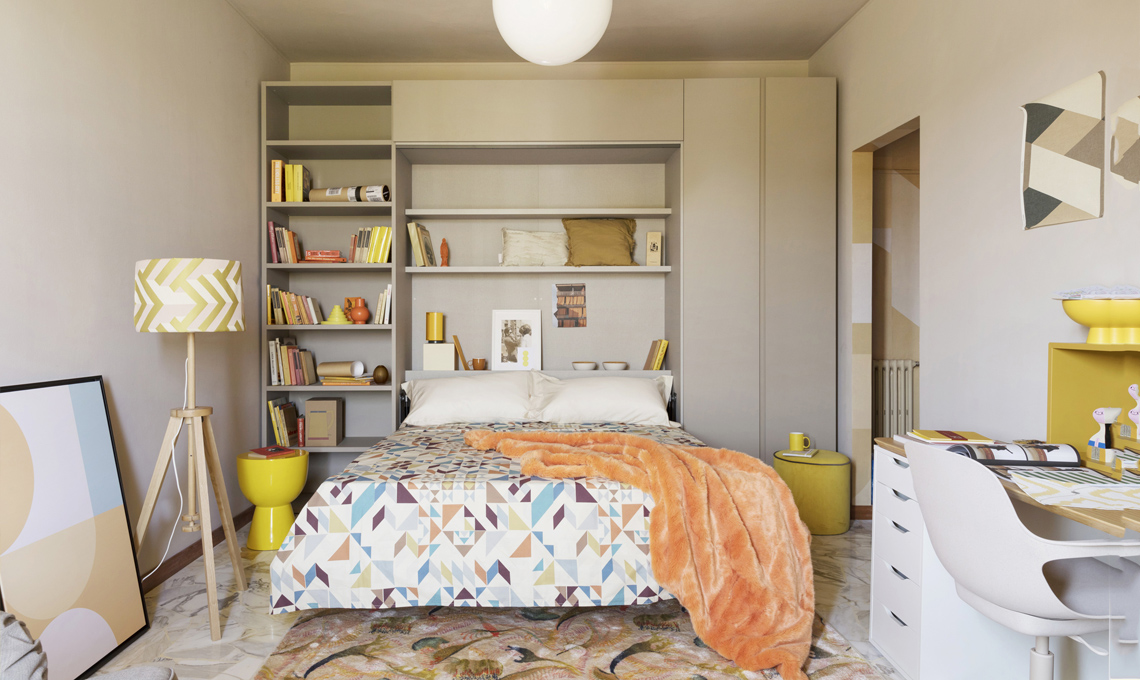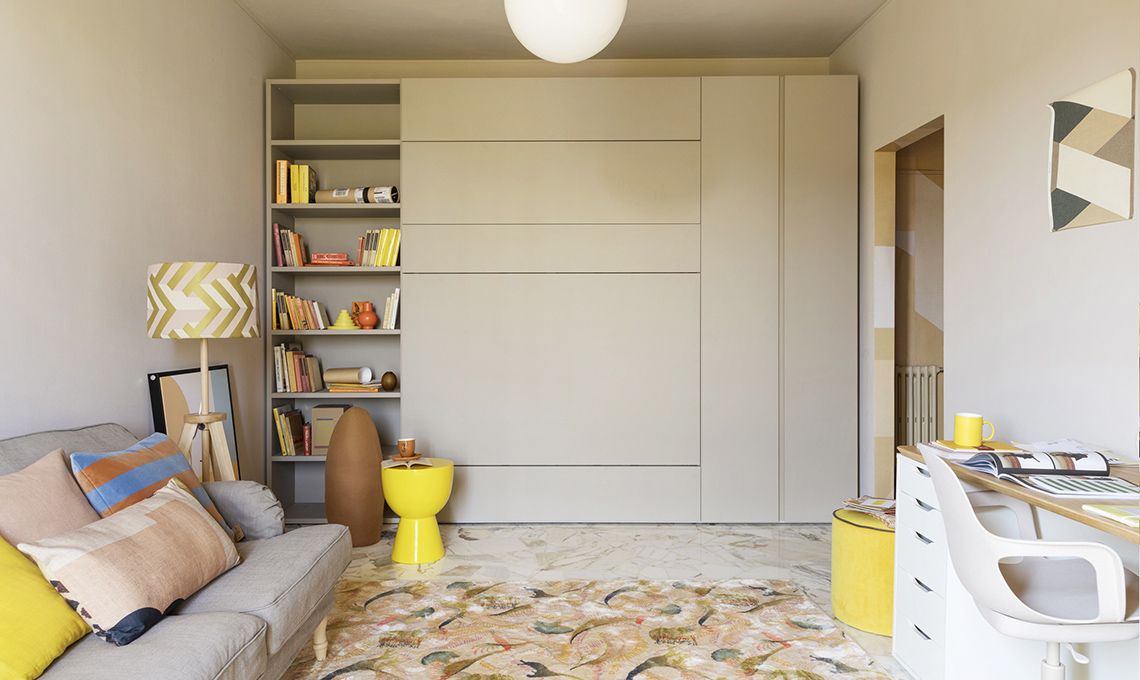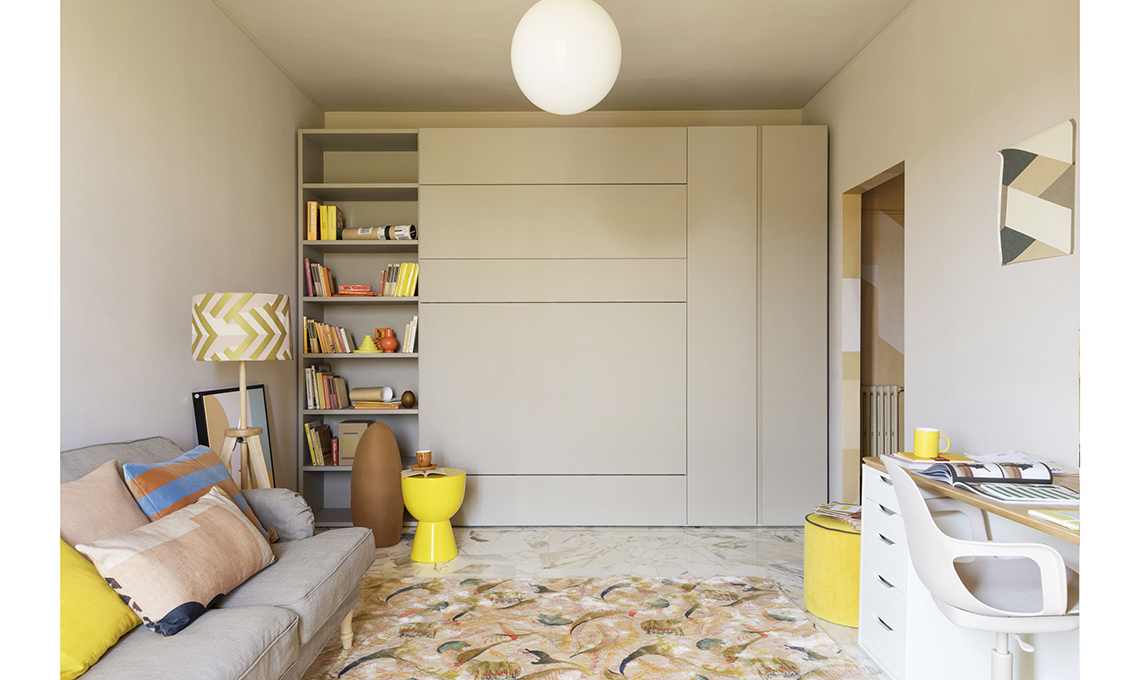 «Il cuore del progetto è una parete multifunzione che in soli 3 metri e mezzo accoglie un letto a due piazze a ribalta (che di giorno si chiude e non ingombra, né si vede), una libreria e un armadio per i vestiti» spiega Giovanna Fra.
