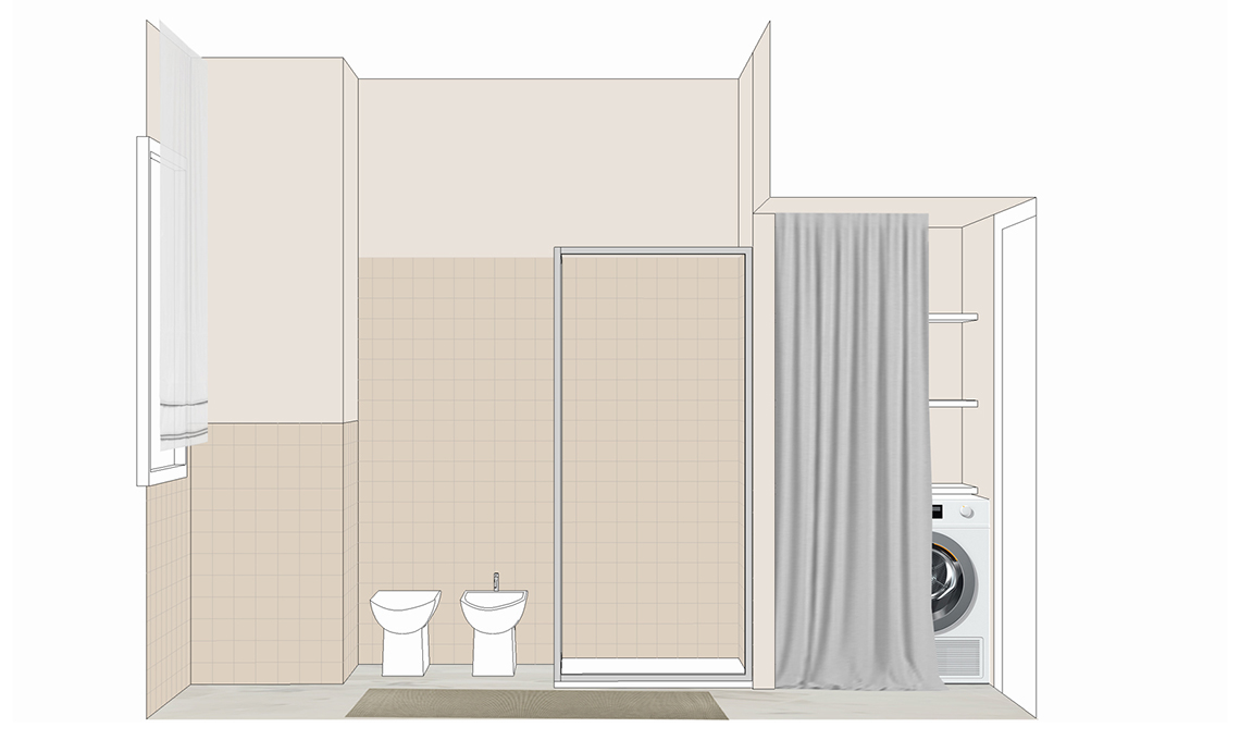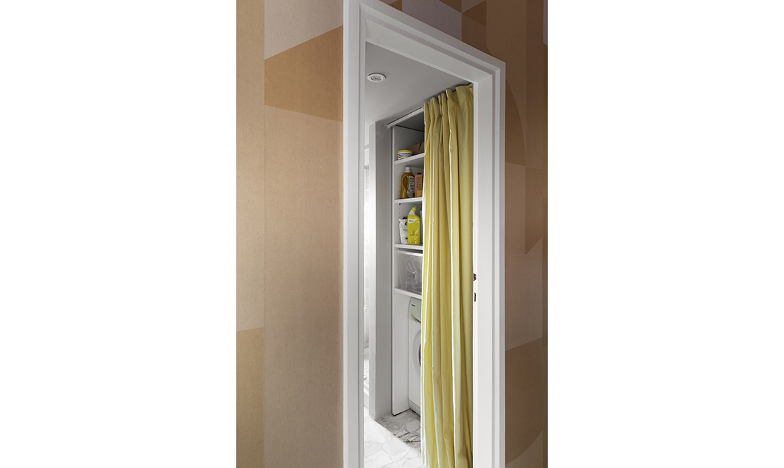 In bagno, a cm 100 dalla porta, Giovanna ha fatto realizzare una quinta a tutta altezza e profonda 70 cm. In questo modo, si crea una maxi nicchia che ospita la lavatrice e, sopra, una scaffalatura utile per i detersivi.