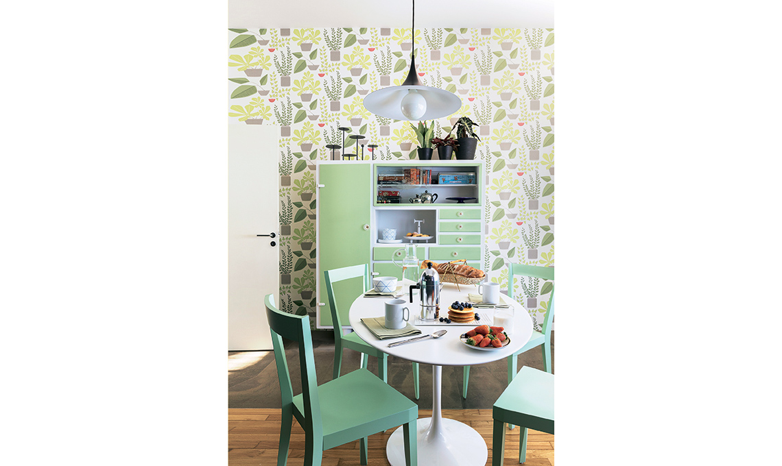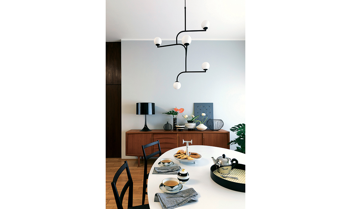€ 470], tazze con piattino più zuccheriera My China! Ca’ D’Oro [Sieger by Fürstenberg] e teiera Bombé [Alessi € 240], tovaglioli [MarinaC]. Sedie 646 Leggera [Cassina da € 635 cad], carrello vintage da [Arcarreda € 340] e stampe [Olivetti]. Sul sideboard vintage [su pamono.it], lampada Spun Light nera [Flos € 950], bottiglia e vaso in ferro [Antonino Sciortino], vasi Regnard II e Reinach più centrotavola Renel I e Roques, tutti di [Driade]. Quadro tridimensionale [Christopher Pisk], sospensione Mobil 100 [Pholc € 608,30].