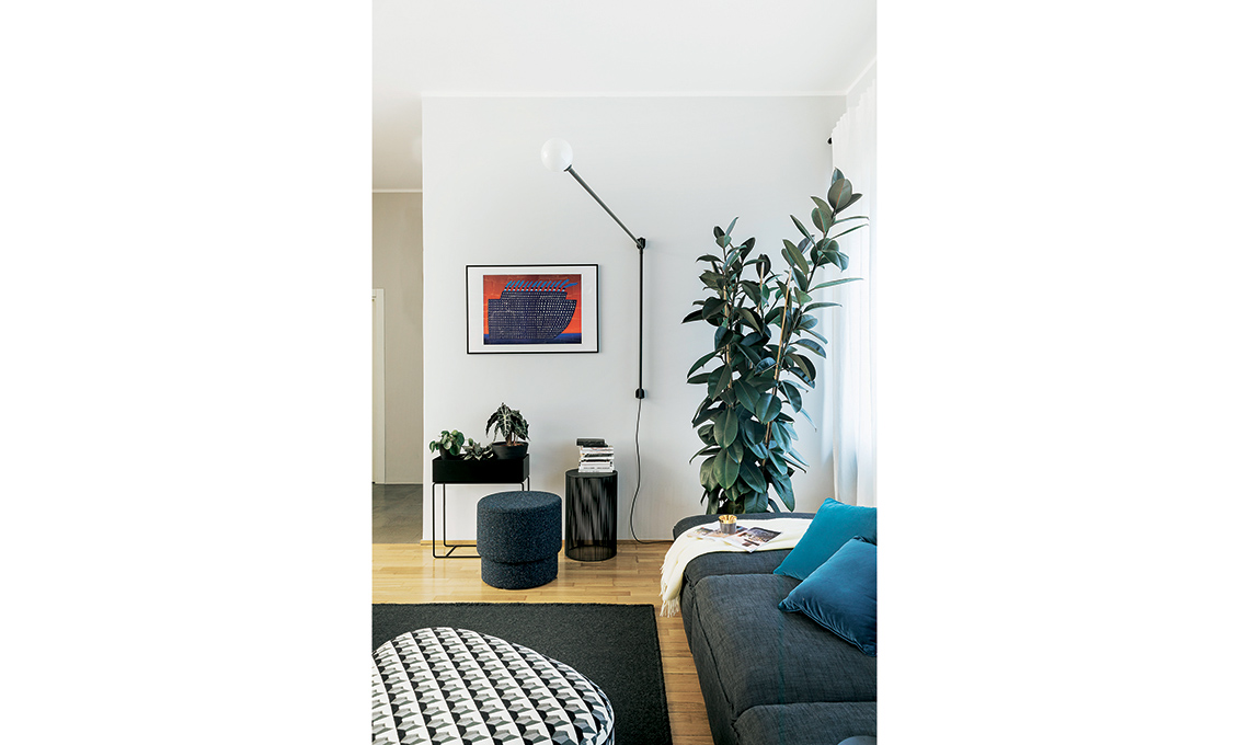 Sul sofà plaid Candy Stripes [Normann Copenhagen, cm 130x200 € 160], tappeto Harvest nero in lana [Kasthall, cm 170x240 € 1.365] con pouf Island [Saba Italia, cm 83x65x38h] rivestito con tessuto Relief bianco e nero [L’Opificio]; a parete, lampada Potence Pivotante con braccio che ruota di 180° [Nemo Lighting, cm 104x200 € 690], pouf Silo Deep Sea/Bolgheri [Normann Copenhagen, ø cm 50x46h € 465], tavolino Cilindro in metallo nero fatto a mano [Antonino Sciortino] e fioriera Plant Box [Ferm Living da Arcarreda, cm 60x25x65h € 199].