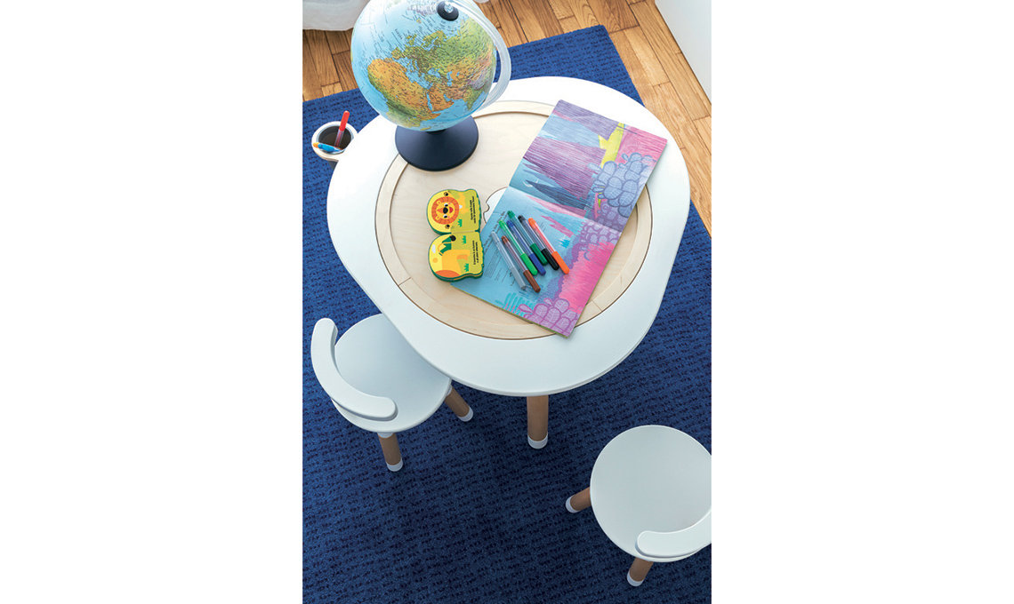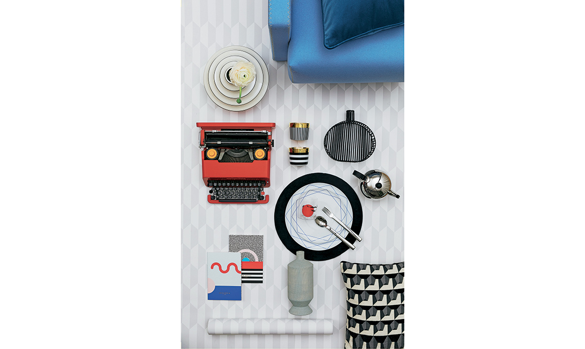Carta da parati Domino Pyramid Powder [Kirkby Design, € 130,50 il rollo da cm 68x10 m], libreria modulare in metallo e legno [String] con uccellino Shorebird [€ 50] di [Normann Copenhagen] come la balena Happy Whale [€ 67] e la caraffa Geo Vacuum Jug [€ 69], orologio Giratempo bianco [Formae € 250]. Scrivania Groove [cm 120x59x75h € 349] di [La Redoute] come la lampada Copita