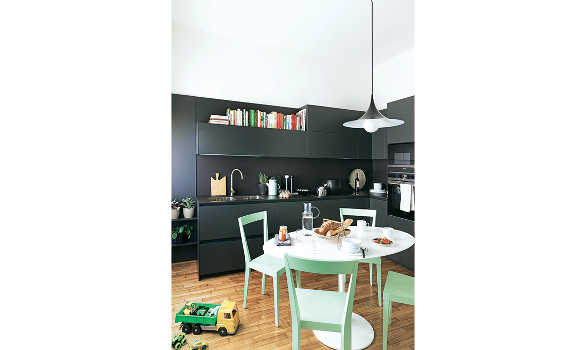 Sul top della cucina Bluna in laccato opaco antracite e piano in grès [Binova], tagliere in legno [Delamont], caffettiera smaltata [Dexam € 20,85], tagliere in marmo nero e macina spezie Mill Large [Normann Copenhagen € 78 e € 115], bollitore 9091 e pentola Mami [Alessi € 210 e € 165]. Sul tavolo con sedie Livia [L’Abbate € 293 cad], mug Dressed [€ 88 il set da 4], posate Rundes Modell e caffettiera, tutto [Alessi], bicchieri e brocca in vetro [Ichendorf], piatti e ciotole [Sieger by Fürstenberg], caraffa [Bormioli Rocco], tovaglioli [MarinaC].