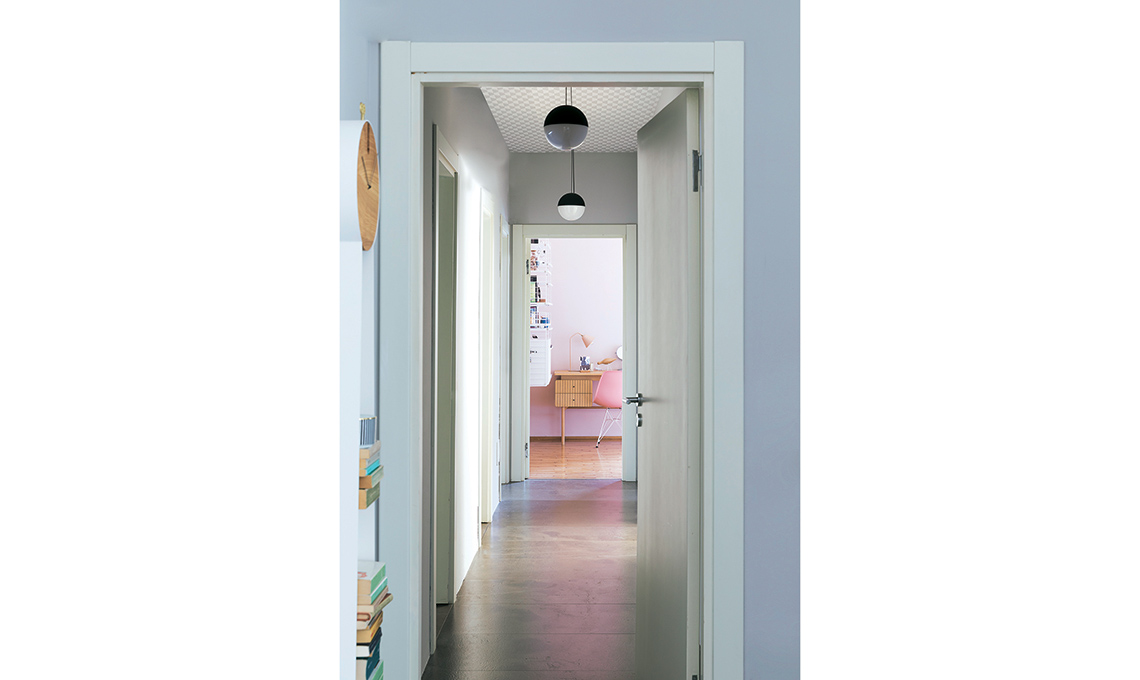 In corridoio, sul soffitto tappezzeria Petite Tile in bianco e grigio [Cole & Son distr. da B&B distribuzione] più luci a sospensione String Light [Flos], pareti dipinte con pittura Alpha Air Clean Mat cod. NN.00.76 [Sikkens].