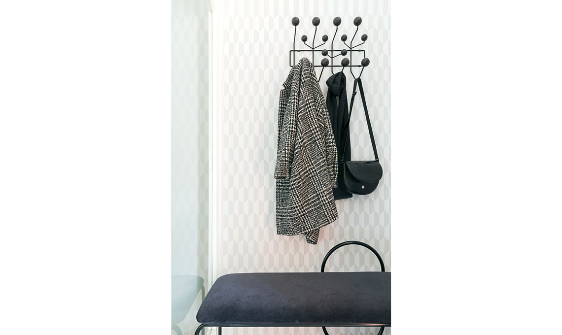 Tappezzeria Petite Tile bianca e grigia [Cole & Son distr. da B&B Distribuzione], appendiabiti Hang It All nero [Vitra € 279], panca [Aytm, cm 110x39x68h € 529].