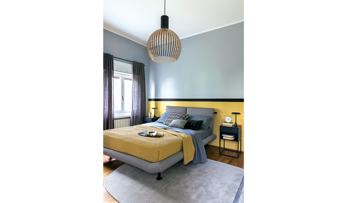 in tessuto Maratea [Noctis € 1.952], set lenzuola Soffio color piombo [€ 199,50] e copriletto Nettare ocra [cm 260x240 € 195], entrambi di [Fazzini]; cuscini bianco e nero Carré [L’Opificio, cm 60x60 € 140], scuro Flair Black Grid [Normann Copenhagen, cm 35x60 € 74] e grigio Signal [Kirkby Design, cm 43x43 € 103]. Sul vassoio Colombina, mug Dressed [Alessi € 55 e € 88 il set da 4]. comodini Vikhammer [Ikea, cm 40x39x65h € 55] con luci Panama Mini [Nemo Lighting € 280 cad], bicchiere e brocca [Ichendorf], orologio Hannah [House Doctor]. La pittura murale per interni è Alpha Air Clean Mat di [Sikkens]: il giallo della boiserie ha codice F2.40.60.