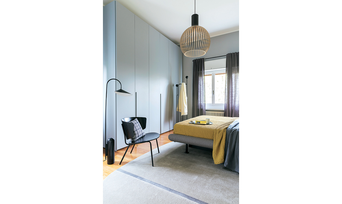 Poltrona Herman e piantana Arum [Ferm Living da Arcarreda € 545 e € 679] con cuscino [Normann Copenhagen]; sospensione Octo 4240 [Secto Design € 800], tappeto Oona [Normann Copenhagen, cm 175x240 € 600], tende Aina [Ikea, cm 145x300 € 55/2 teli]. Armadio [Moretti Compact], sullo stand Pujo [Ferm Living da Arcarreda € 405], plaid Tivoli [Normann Copenhagen € 160].
