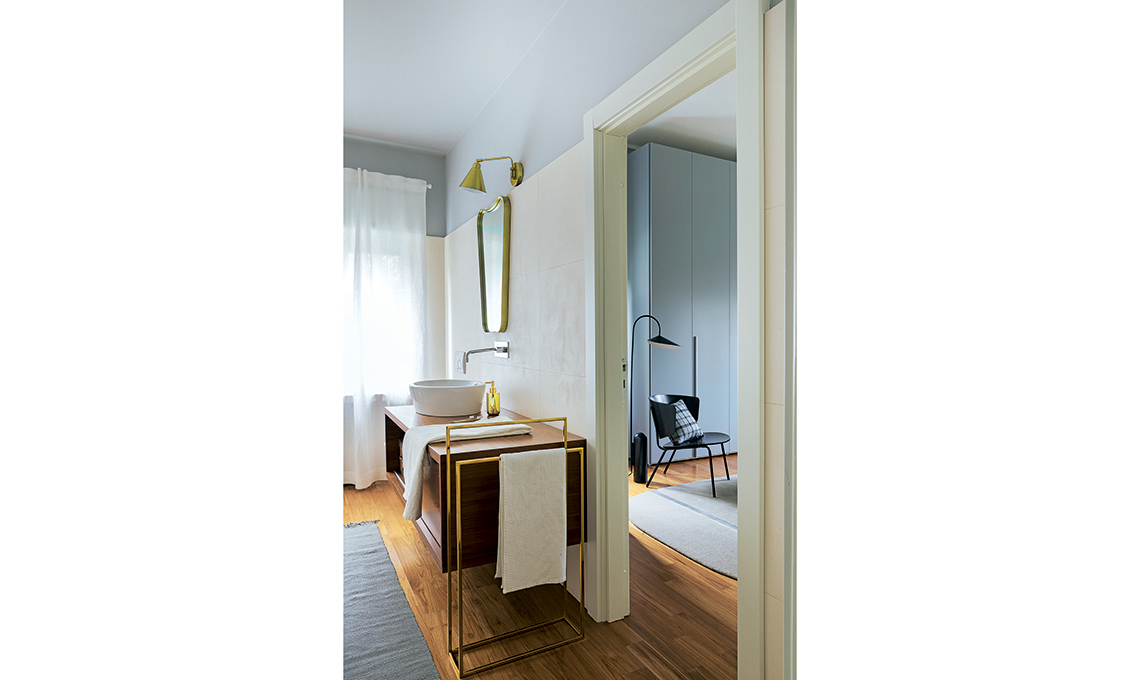 Specchio Goldie [Westwing, cm 50x80 € 249], lampada [House Doctor € 149] e portaasciugamani [Bloomingville € 105].