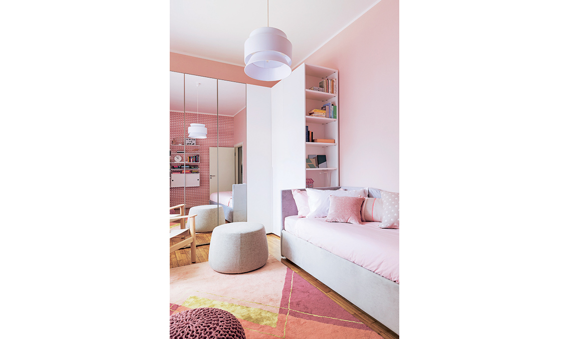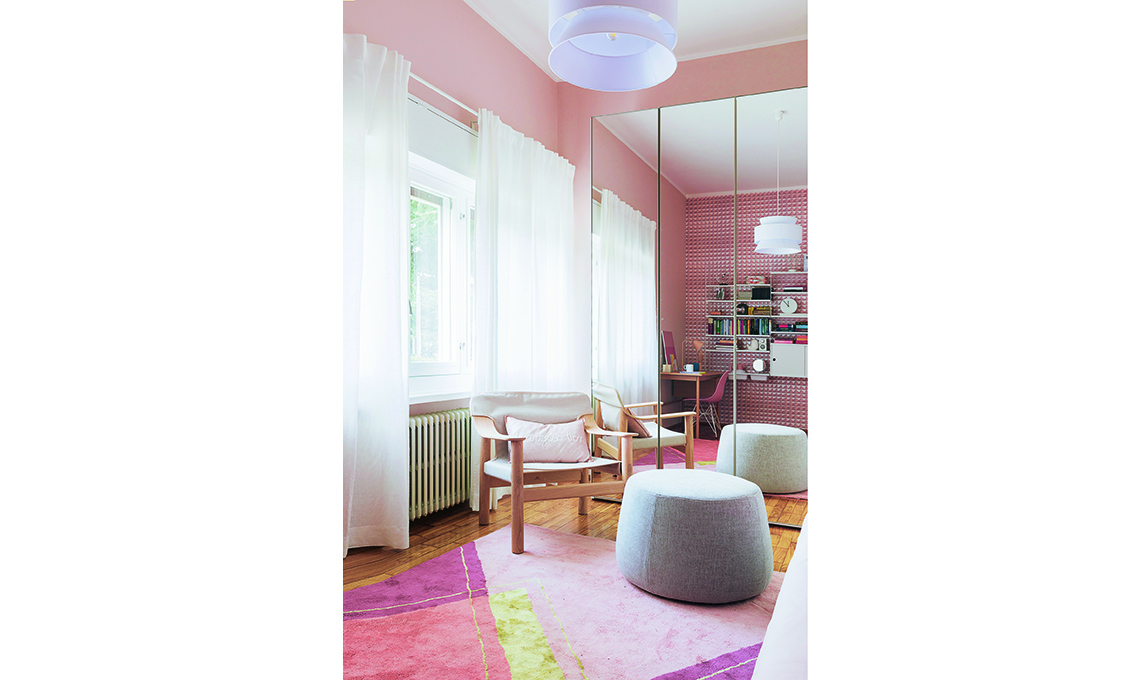 € 84,50]. Tappeto rosa [La Redoute] come la sospensione Dolkie, poltrona Bernard [Hay da Arcarreda € 1.289] con cuscino Ti Voglio Bene [Fazzini € 38]; pouf grigio Eirene [Meme Design € 900] e rosa tricot Conrad [Beliani € 99].