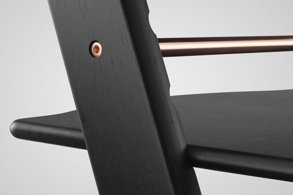 Il legno di rovere, disponibile in due colorazioni, ideate esclusivamente per la collezione, è in grado di esaltare la qualità e la struttura del materiale. Per rendere ancor più esclusivo il prodotto sono stati scelti dettagli anche per le parti metalliche, placcate in acciaio o oro rosa. Ogni Tripp Trapp® sarà inoltre numerata da 1 a 2.000 per colore e porterà l’incisione del nome del designer Peter Opsvik.