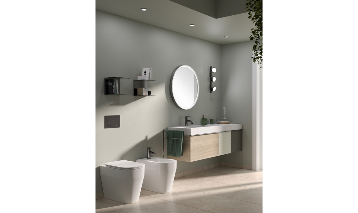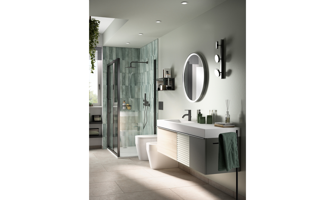 Mobile Pixel [composizione cm 150, €1602], specchio con illuminazione integrata bagno tondo Sfera [cm 75x75, €149,90], rubinetteria Cloud nero opaco [Jacuzzi rubinetteria, €84,90 cad.], vaso wc e bidet a pavimento filo muro tutto evo [Olympia Ceramica, €199 e €189], mensole in metallo Cbook [cm 25x16, €20,99 cad.], portaspazzolini e porta sapone Olivia [€10,49 e €14,49]. A pavimento, piastrella Draft Light color bianco [cm 60x120x0,9, €29,99/mq]; box doccia Record [base cm 120x80, €409,00], piastrella Bistrot color verde [cm 31x62x0,9, €24,90/mq]