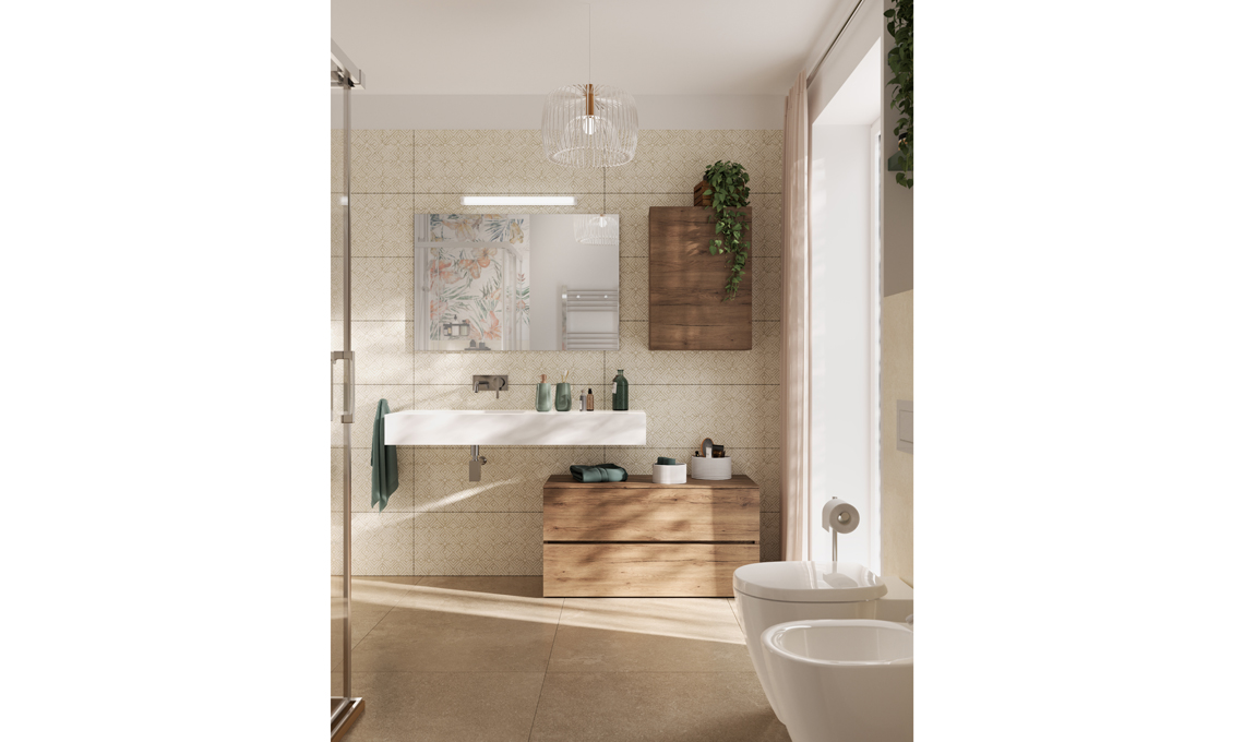 Mobile Barrik effetto rovere barrique [composizione base, lavabo, pensile e specchio, €1767], rubinetteria Cloud in finitura cromato lucido [Jacuzzi rubinetteria, per lavabo €99,90, per bidet €74,90], vaso wc a filo parete Idealsmart Aquablade e bidet a filo parete Idealsmart [Ideal Standard, €389 e €199], lampadario scandinavo Anemone [Inspire, cm 45x45x120, €63,90]. A pavimento, piastrella Suave Stone colore Intens Beige [cm 75x75x0,9, €29,99/mq]; a parete, piastrella Suave Dec Geo beige [cm 32,5x97,7x0,6cm, €36.99/mq]