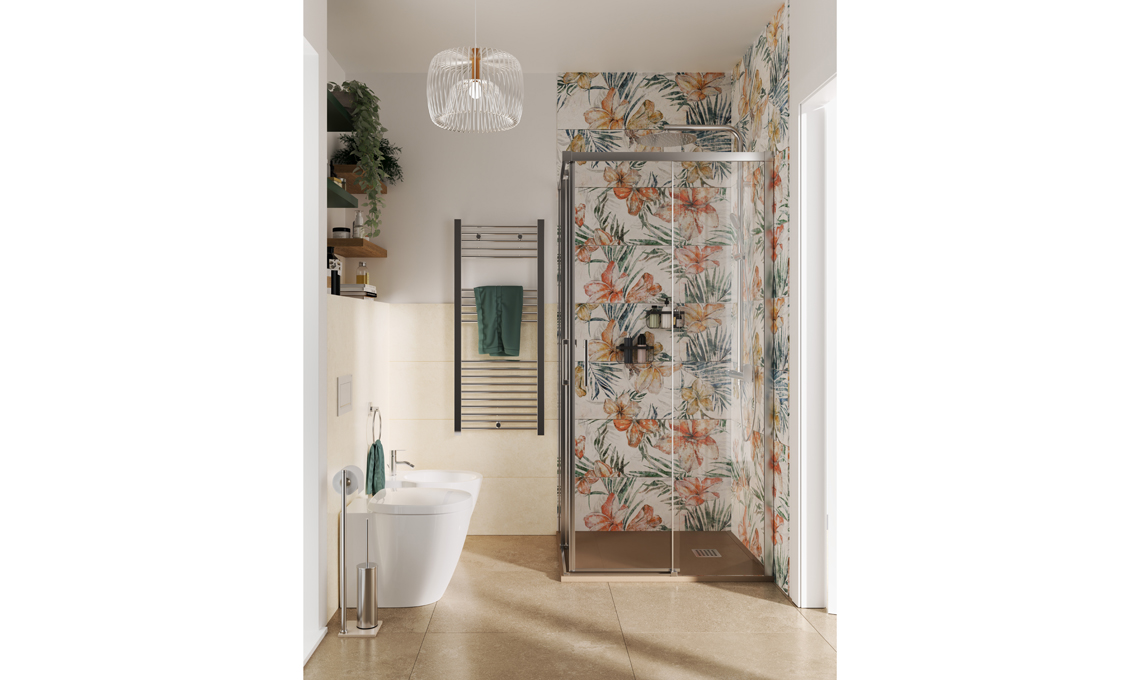 Per creare un’atmosfera riposante e accogliente, scegli rivestimenti in un beige intenso, caldo, e superfici materiche, che ricordano l’effetto della pietra; per le pareti puoi optare per piastrelle con un delicato disegno geometrico tono su tono.