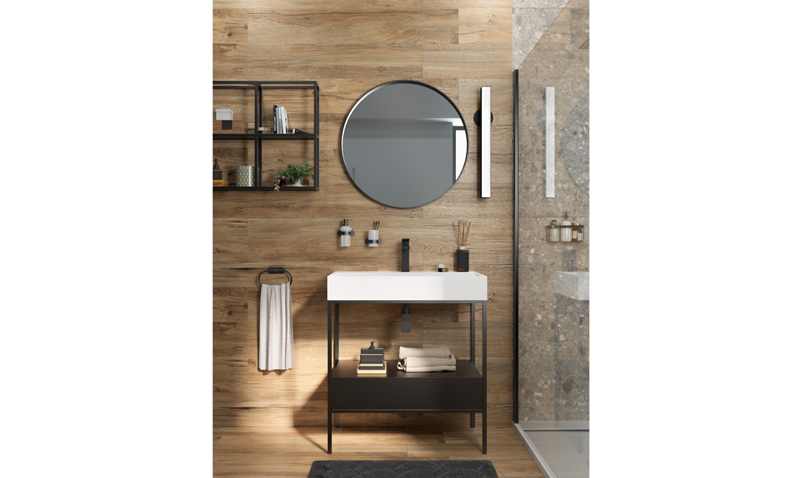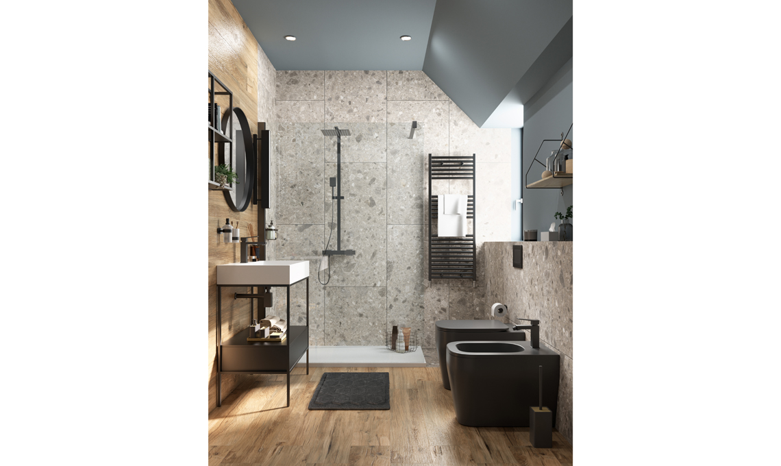 Mobile bagno Outline nero opaco [cm 80, €858], vaso wc e bidet a filo parete tutto evo [Olympia Ceramica, €330 e €295, più copriwater rettangolare €145], rubinetteria Studio nero cromato [Sensea, per lavabo €59,90, per bidet €54,90], colonna doccia Studio con soffione quadrato, finitura nera [Sensea, €179,90], accessori Orea Black nero opaco [Wenko, da €12,49], mensola Karina rovere naturale [cm 60x21,3, €19,90]. A pavimento, piastrella Antique color marrone [cm 20x121x1, €19,99/mq], rivestimento effetto cemento Ceppo bianco [cm 60x120, € 24,99/mq], pittura murale traspirante color Smoky [Fleur, l 0,75, €17,90]