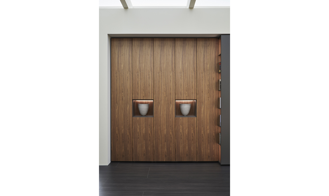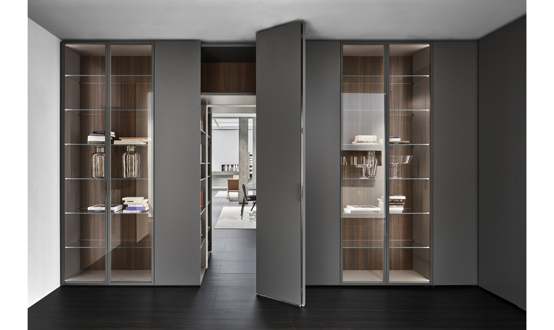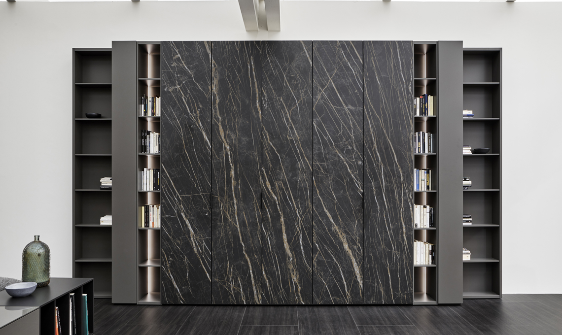 La libertà compositiva non si limita però alle dimensioni, ma anche alle finiture: la novità è rappresentata dal Kera, lastra ceramica sottile, che riproduce le naturali venature del marmo, ma Freedhome è disponibile anche in versione laccata o con pannelli in legno a vena continua. In particolare la finitura noce è un'opzione elegante e senza tempo, che permette di ottenere un disegno continuo e regolare che trasforma la superficie della ante in una boiserie a tutta parete.