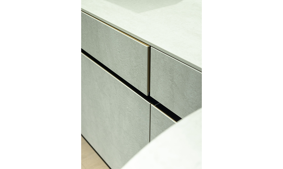 Le ante Glass 2.0, il top dell’isola e il piano snack sono in Laminam Pietra di Savoia Perla, una tonalità che conferisce un'allure di grande raffinatezza. Le ante si distinguono per un prezioso dettaglio: il telaio in finitura champagne su cui sono montate. Il sistema di apertura è a gola traslata, posizionato sotto i cassetti per servire sia questi ultimi sia le basi sottostanti.