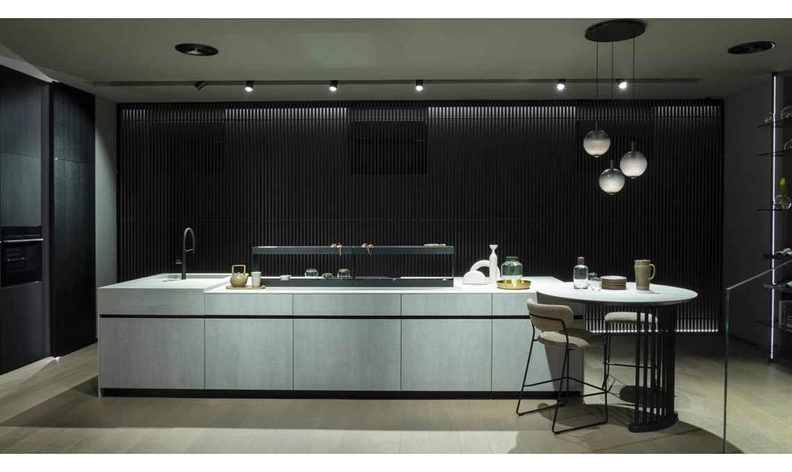 Le colonne, appartenenti al modello Asia, sono divise in due blocchi: uno alle spalle dell’isola, realizzato in impiallacciato lava millerighe, e l’altro a fianco dell’isola. Quest'ultimo presenta un contrasto tra la finitura rigata dell'area dove sono incassati i forni e quella liscia, in laccato lava, delle colonne che la abbracciano a destra e a sinistra. Ilpiano snack della collezione Tuttotondo è posto in appoggio sull’isola e sul supporto Stilo in versione tonda in finitura impiallacciato lava. Quest’ultimo è composto da un susseguirsi di tondini inseriti in una base in legno massello.