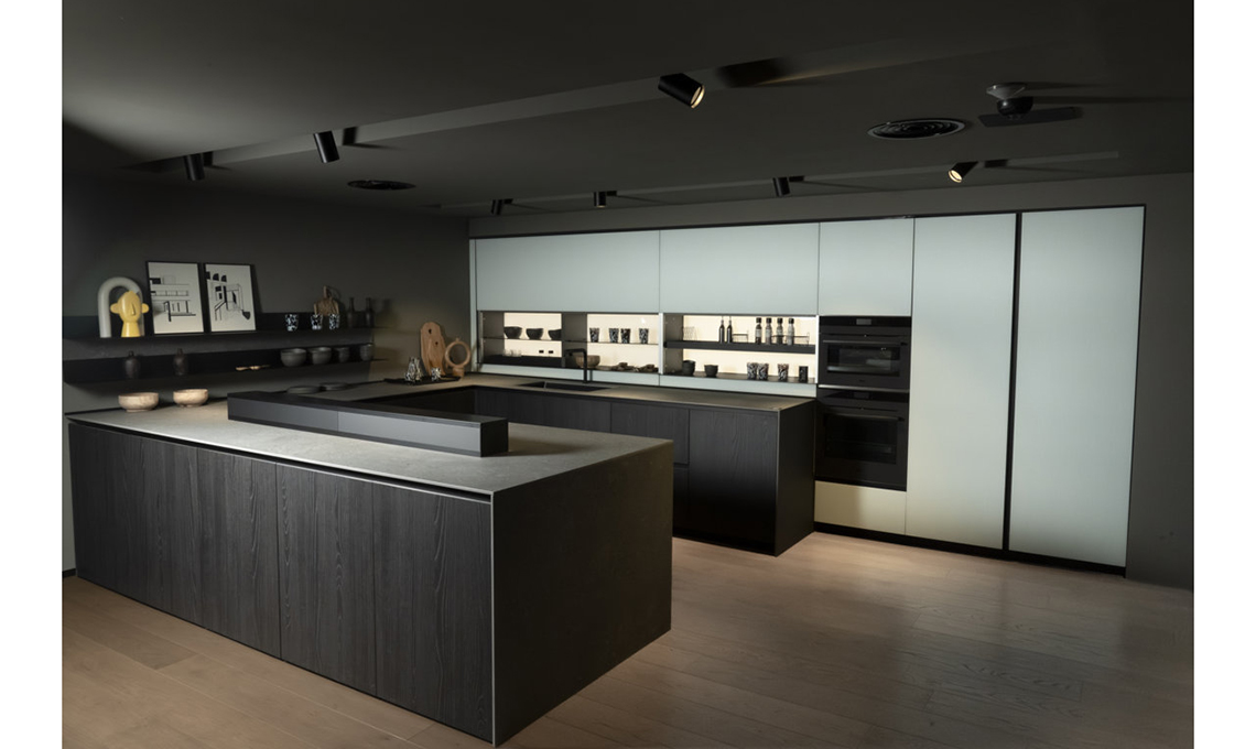 La cucina che abbina Glass 2.0 e Kalì è pensata per uno spazio ampio e conviviale, occupato da persone che amano cucinare, aperto sul living e ha una struttura a golfo, perfetta per muoversi in modo ergonomico.