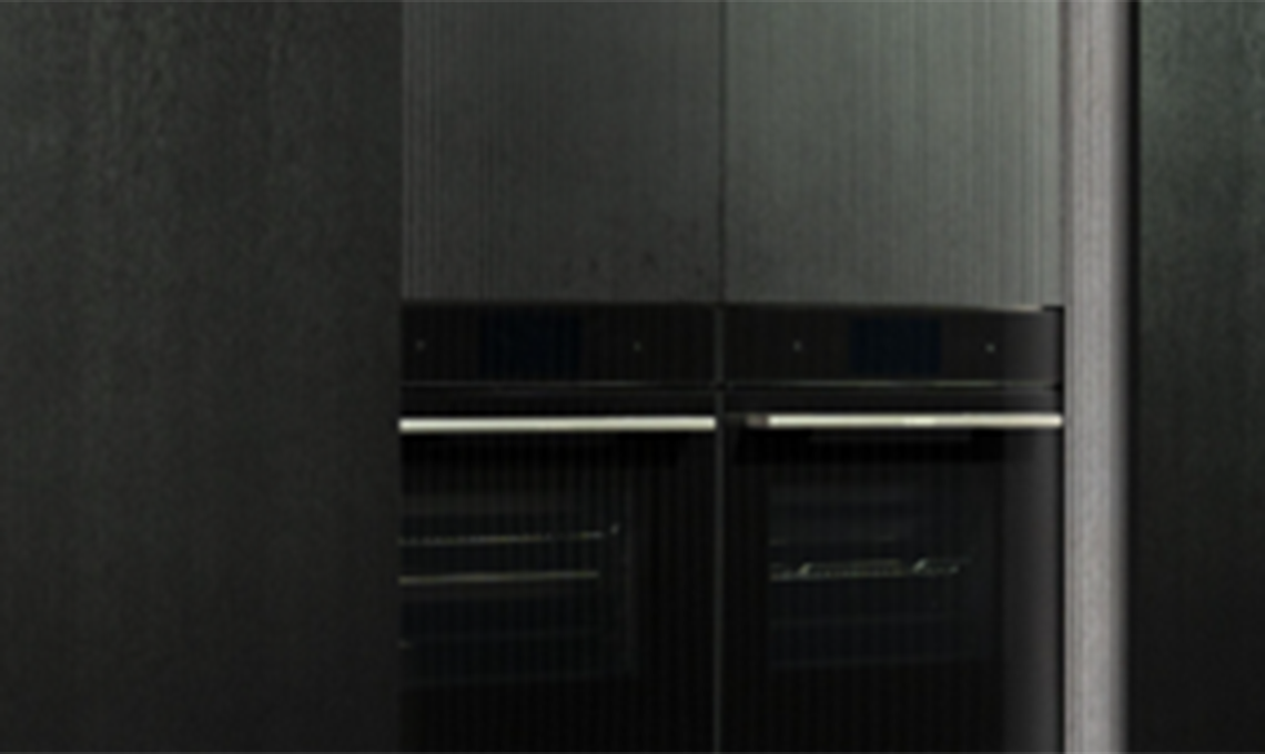 Le colonne appartengono al modello Asia e sono divise in due blocchi, l’uno alle spalle dell’isola e realizzato in impiallacciato lava millerighe, l’altro di fianco all’isola. Quest’ultimo propone un gioco fra la finitura di tendenza rigata dell’area in cui sono incassati i forni e quella liscia, in laccato lava, delle colonne che la abbracciano a destra e a sinistra.
