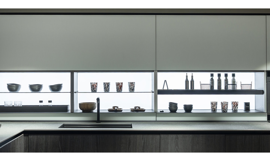 Dietro l’area lavaggio, dettaglio del modulo Mover aperto, lo schienale con un’anta a scorrimento verticale verso il basso. Qui è proposto con fondo luminoso e ante in vetro micro-cannettato.