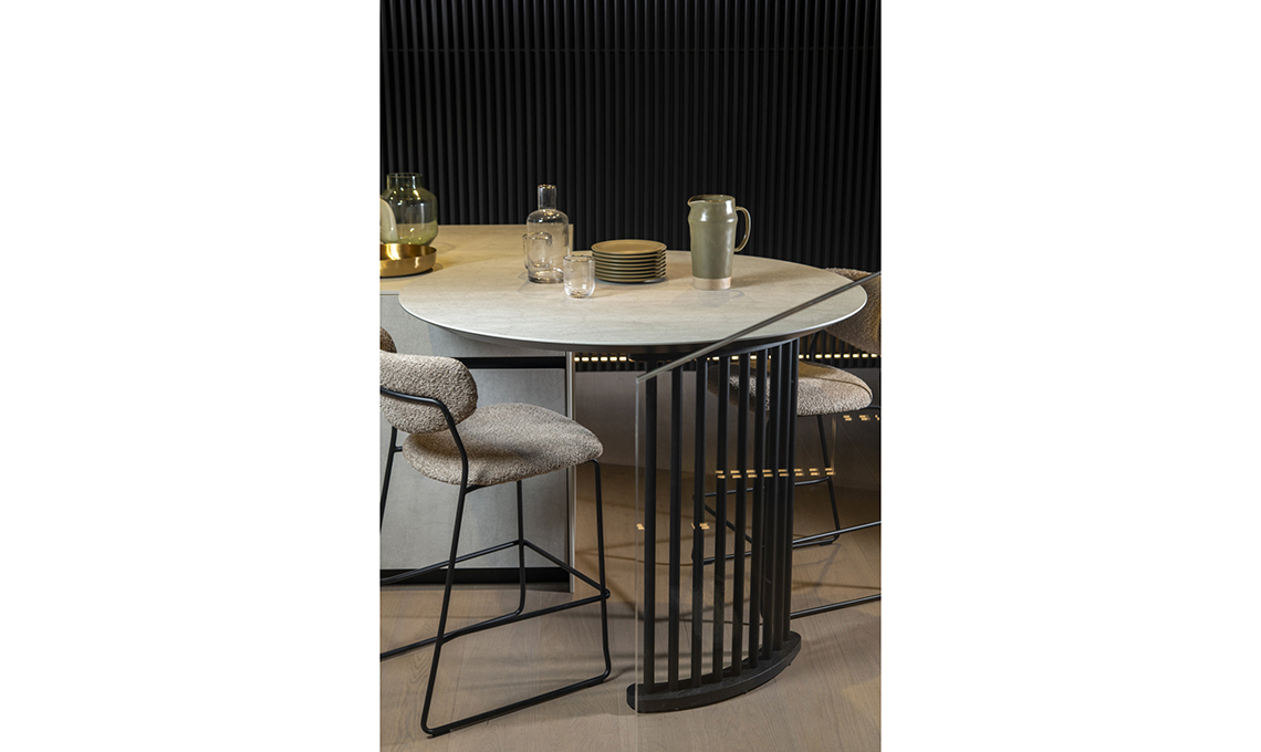 Il piano snack della collezione Tuttotondo è posto in appoggio sull’isola e sul supporto Stilo in versione tonda in finitura impiallacciato lava. Quest’ultimo è composto da un susseguirsi di tondini inseriti in una base in legno massello.