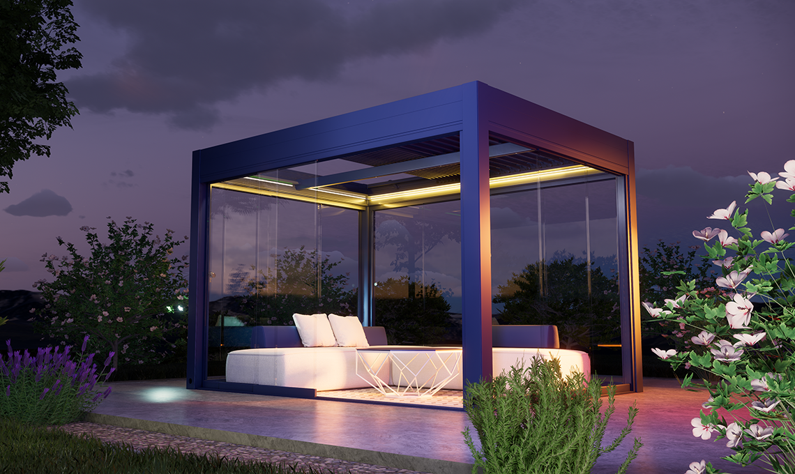 Grazie alla possibilità di installare vetrate perimetrali è possibile vivere il benessere di una vita all’aria aperta in ogni periodo dell’anno. Inoltre l’illuminazione LED integrata crea la giusta atmosfera, dal tramonto fino a tarda sera.