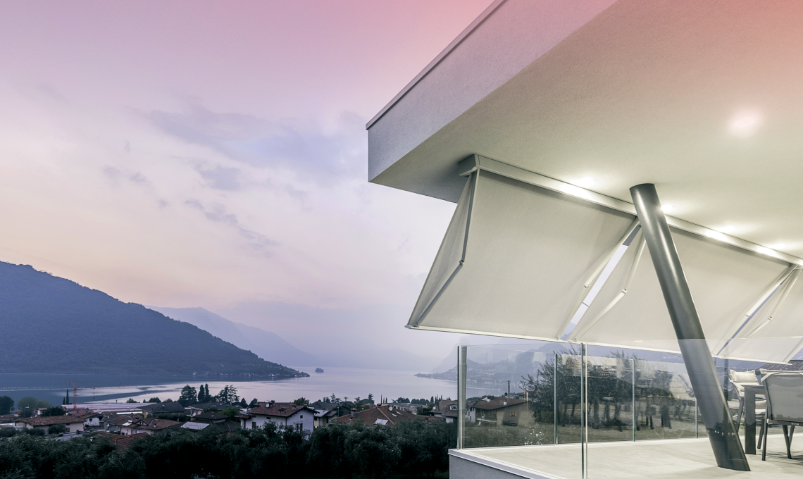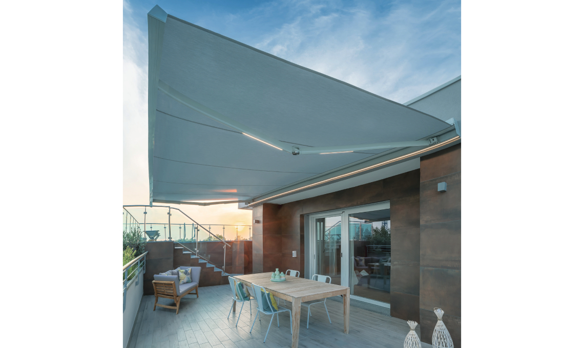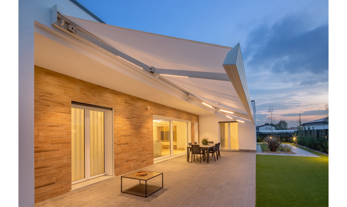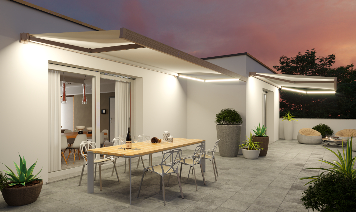 Per i balconi più piccoli, la tenda a bracci R75 Stone trasforma lo spazio in un angolo di comfort e stile, senza rinunciare all’eleganza. Il cassonetto a scomparsa totale protegge telo e struttura, mentre le luci a LED integrate creano atmosfere calde e accoglienti la sera. Il suo design compatto, l’effetto pietra brevettato e la possibilità di personalizzare colori e optional la rendono una scelta perfetta per gli affacci condominiali che desiderano distinguersi con eleganza.