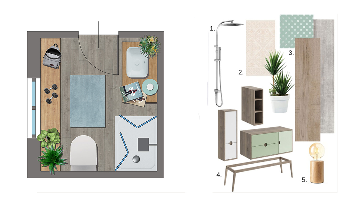 La moodboard che racconta i colori, le finiture e lo stile scelto per trasformare il bagno di servizio, in bagno dei sogni [articoli disponibili da Leroy Merlin]. Foto: Francesca Giovannini