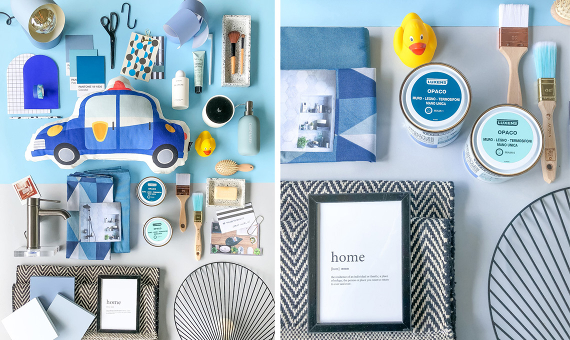 La moodboard di Alessandra per raccontare le scelte fatte per il bagno ideale: dettagli neri e sfumature polverose dell'azzurro per un bagno moderno a misura di bambino [Prodotti Leroy Merlin]. Foto: Alessandra Barlassina