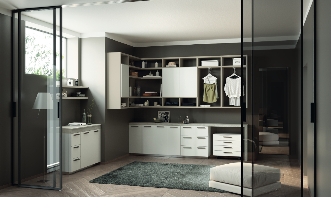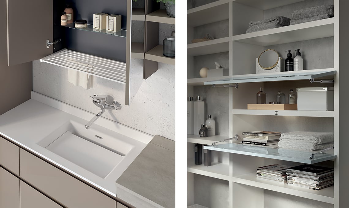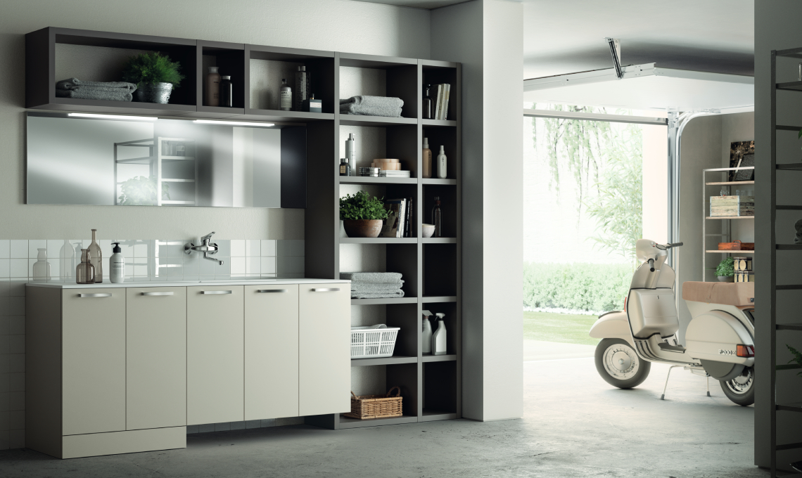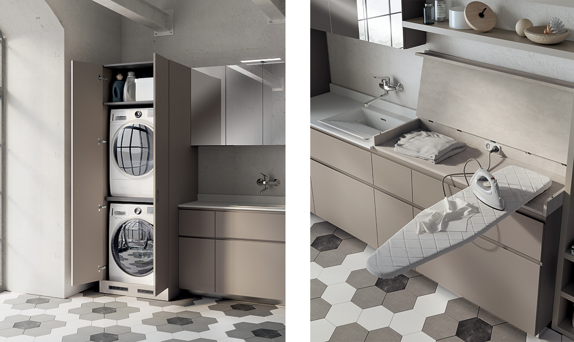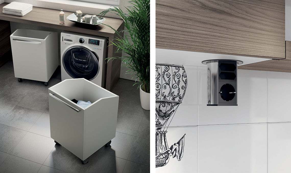 Una super chicca? La parete portaccessori in monofinitura bianco opaco che, girando su sé stesso, permette di sfruttare entrambe i lati grazie a mensole e ganci porta abiti da un lato e, dall’altro da specchiera e porta salviette. Anche il lavatoio in mineralmarmo è stato disegnato e prodotto in esclusiva per Scavolini in modo da integrarsi perfettamente con la base da 70cm. Le sue dimensioni e profondità permettono che venga sfruttato per le attività domestiche in modo facile e comodo, grazie anche alla tavoletta estraibile, anch’essa realizzata in mineralmarmo.