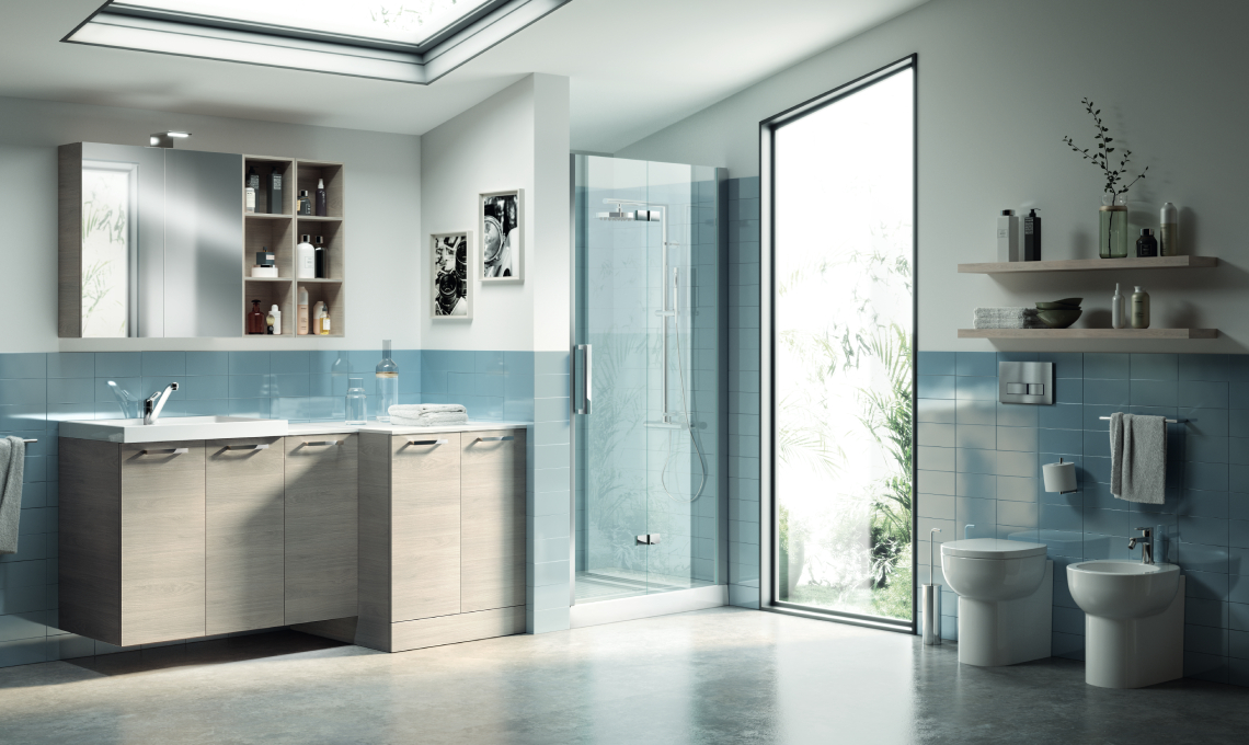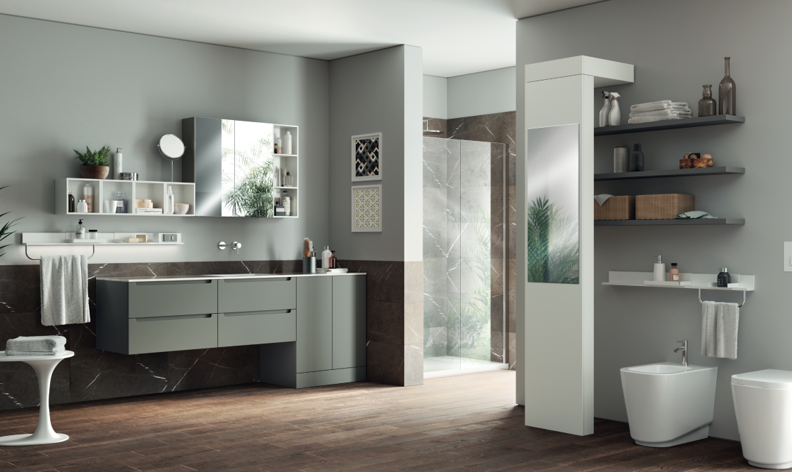 Nell’immagine, ambiente bagno arredato con la collezione Idro, integrata con gli elementi lavanderia del progetto Laundry Space di Scavolini. La composizione in Laccato opaco Grigio Titanio include: pensile con stendino estraibile Smart, elementi a giorno, basi sospese, base portalavatrice, lavatoio Kit integrato; a destra, parete girevole Around.