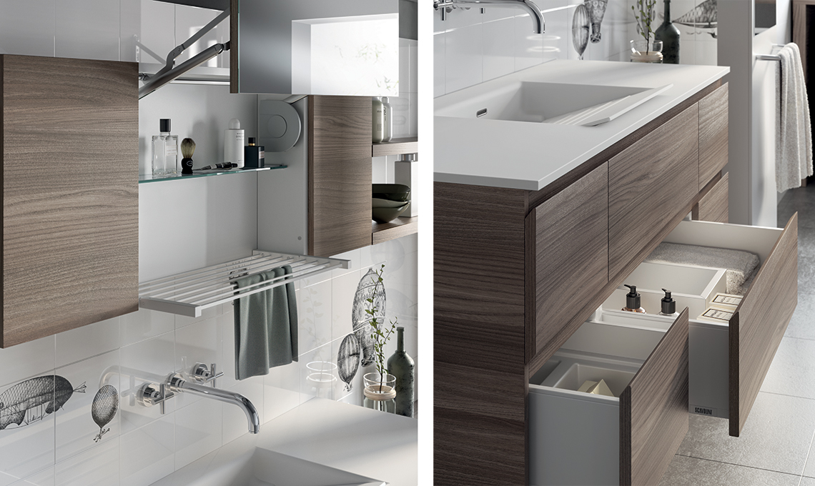 Nell’immagine, dettaglio di ambiente bagno arredato con la collezione Aquo di Scavolini. L’abbinamento di Laundry Space con il Sistema parete Fluida, grazie a profondità, vani configurabili e sviluppo in linea o ad angolo, permettono di realizzare (tramite l’aggiunta di appendiabiti estraibili) anche una confortevole zona guardaroba.